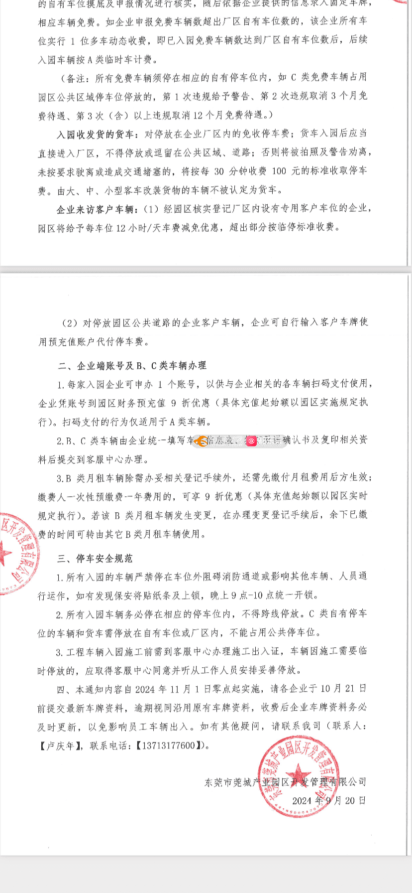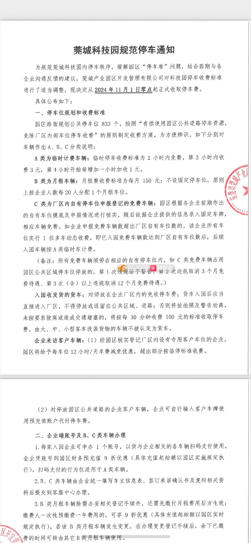 据莞城资产中心了解,为调节园区道路车位供需矛盾,提高路面车位利用率,解决企业集中反映的周边外来无关车辆乱停乱放及长时间占用车位问题,这现象造成道路交通堵塞,给企业日常生产运作造成影响,带来安全应急隐患。根据《东莞市机动车停放服务收费管理实施细则的通知》(东府〔2018〕92号)的有关规定,为缓解园区停车难、停车久、乱停乱放等问题,产业园管理公司对园区道路停车进行统一规范管理,并按规定在园区出入口显著位置设置了标价牌,对外公示停车收费标准,对占用园区公共道路停车位的车辆进行收费,对停放企业厂区内部车位并已上报园区登记的车辆免收停车费,对外来车辆按临停时间计费。园区企业员工可通过所属企业向园区登记免费或月租车。