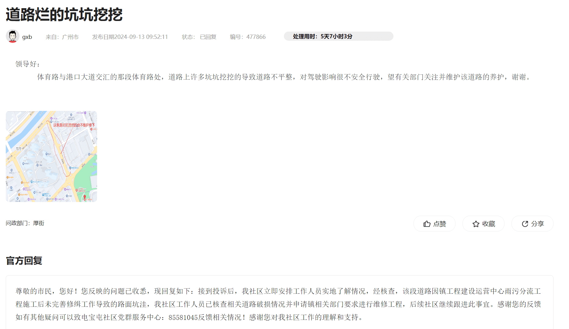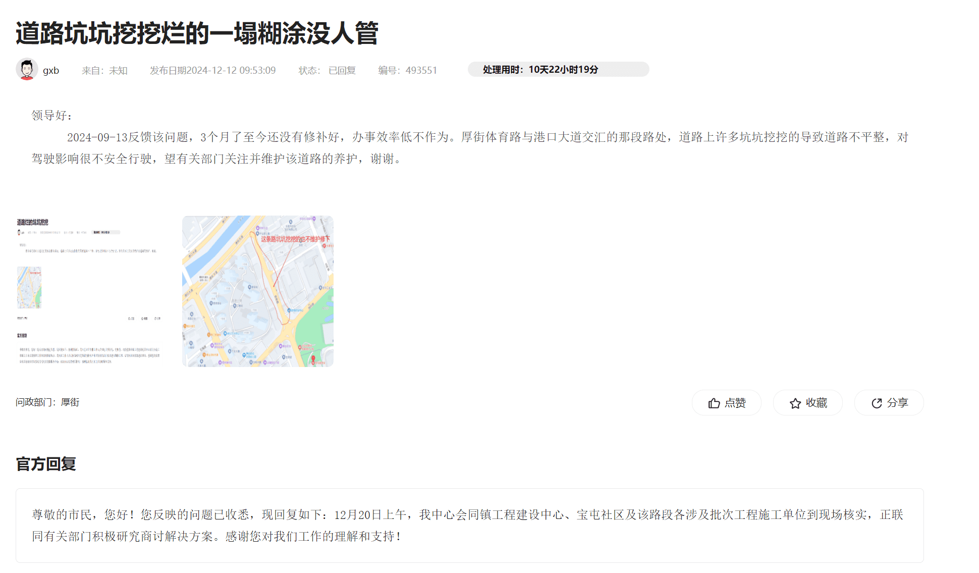 尊敬的市民,您好!您反映的问题已收悉,现回复如下:您反映厚街体育路与港口大道道路路面破损问题,经各方会商,鉴于管网公司计划维修该路段2G1~2G3井室井盖,届时需破除周边路面,管网公司秉承国企担当,对该井室周边5米范围内破损路面做同步修复工作,预计于2025年2月28日前进场实施修复,3月10日完成修复。2025年1月23日,工作人员联系您告知上述情况。如有疑问,可致电宝屯社区党群服务中心:85581045咨询!感谢您对我社区工作的理解和支持!