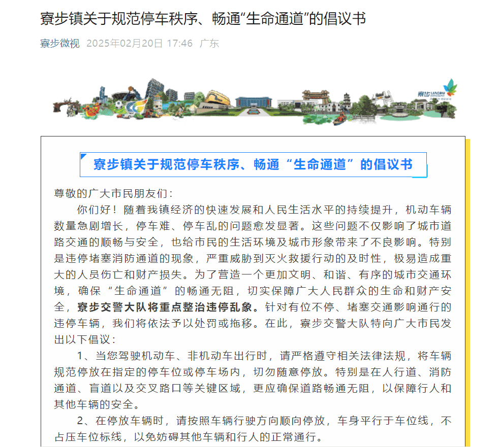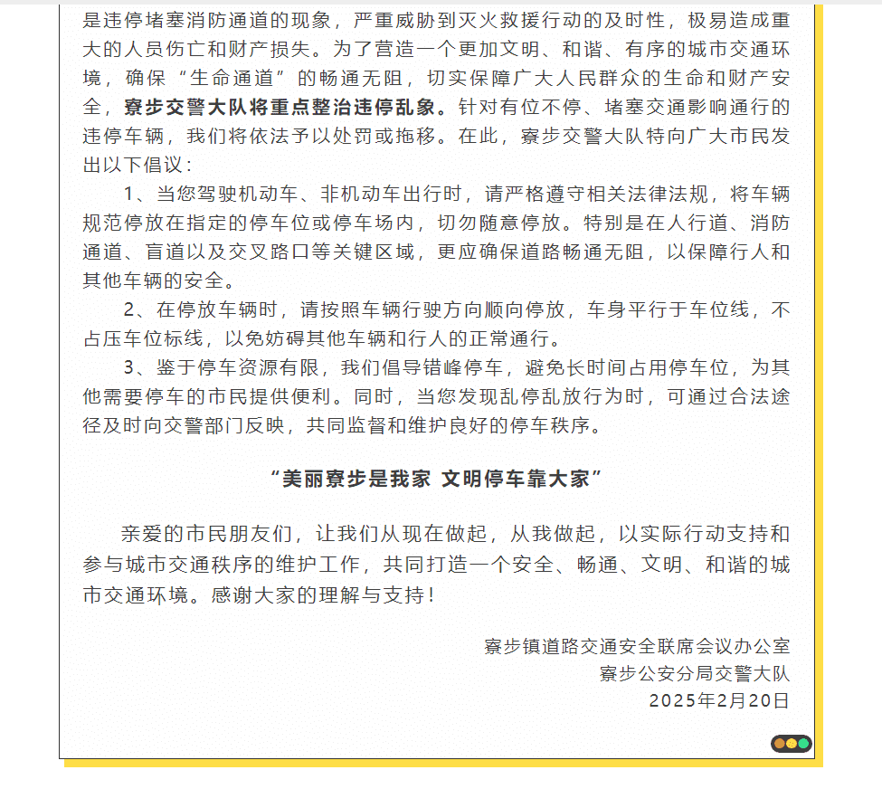 投诉寮步镇上屯村黄沙河西路与西南路红绿灯交界处车辆乱停乱放现象,每天到晚上8点以后,车辆全是违反交通法规乱停,一直会停到明天早上,把停在停车位上的车辆全部堵住,把一边的道路完全堵住,车辆经过时都要逆行而过,现在还有把车头直接朝道路外停靠的,这个地方已经因为逆行多次发生交通事故,希望有关部门重视! 寮步交警大队来粘贴一些温馨提示,贴完之后一开始有点效果,几天后还是继续乱停乱放,希望交警大队依据交通法规进行金额处罚。温馨提示是没用的,要进行罚款才会有作用。 最近寮步官方发了《寮步镇关于规范停车秩序、畅通“生命通道”的倡议书》,希望寮步公安分局交警大队可以严格执行倡议书的内容“寮步交警大队将重点整治违停乱象。针对有位不停、堵塞交通影响通行的违停车辆,我们将依法予以处罚或拖移。”,如果还是不作为,这倡议书有何用呢?