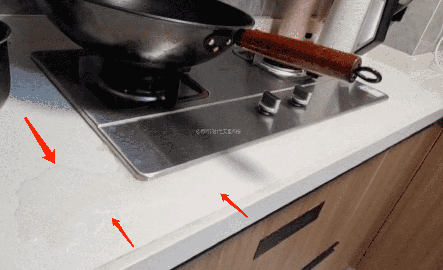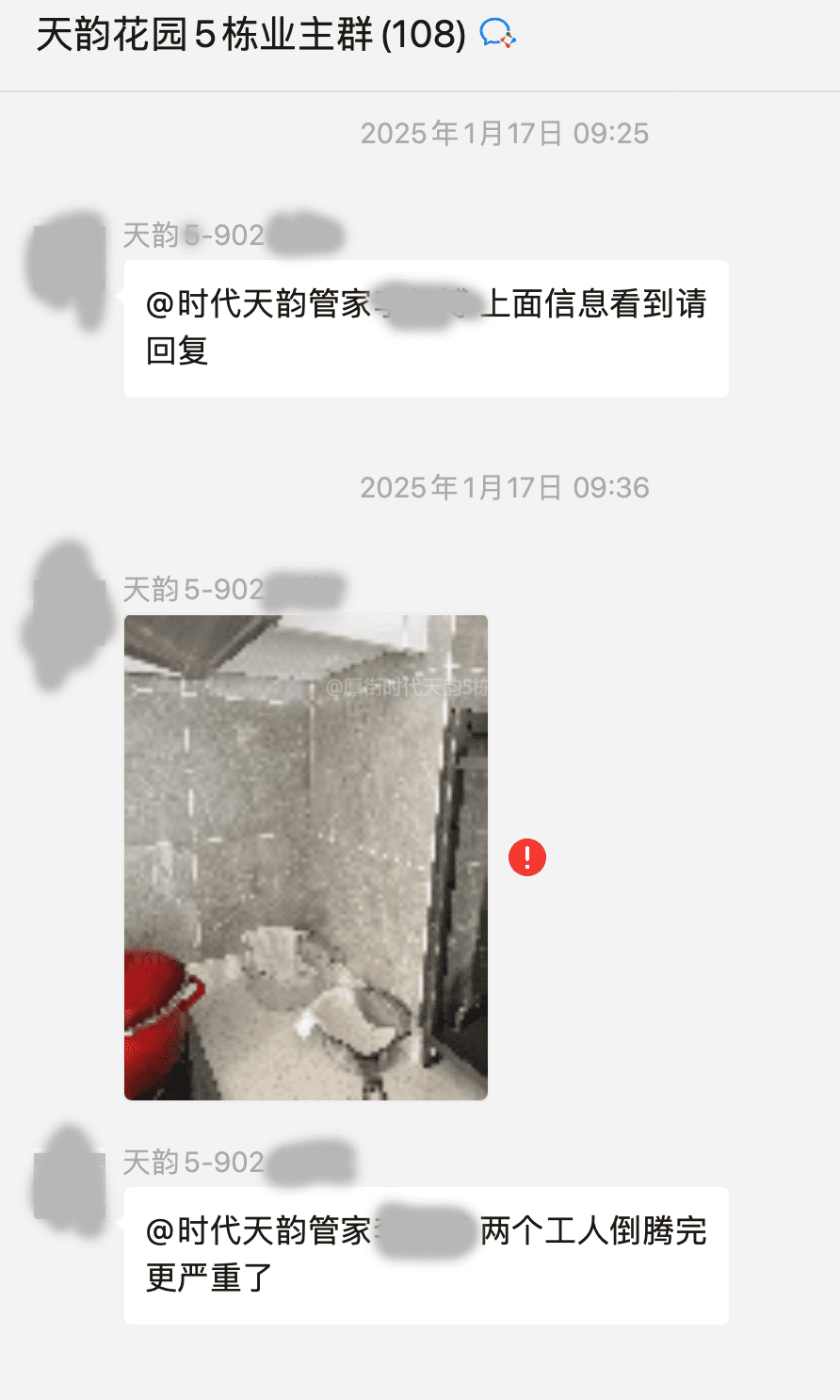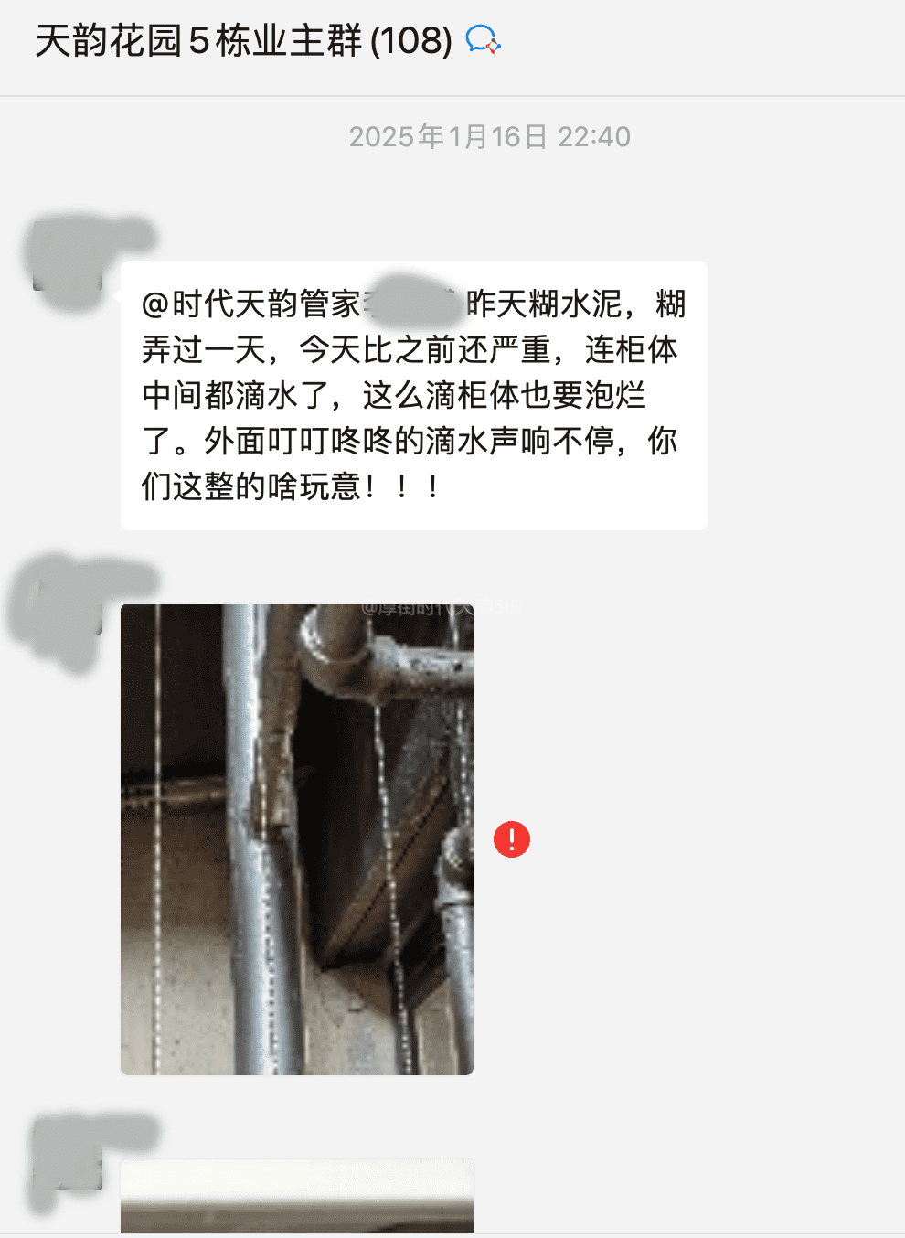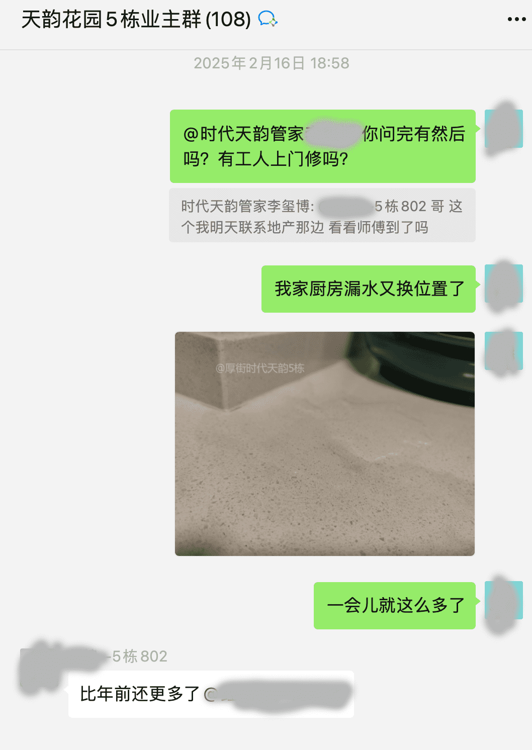 (一)投诉事件 5栋02户8-11楼厨房墙壁漏水,从2024年11月22日至今天,历时3个多月,相关业主期间多次催促(群微信记录为证),物业&维保仅上门维修2次且未解决漏水问题,现已造成的后果: 1、10楼02户一部分厨柜腐烂发黄流污水、以及灶台面板已产生块状水渍2块,大小约为10*60cm、9*20cm(均有实物&照片为证); 2、8-11楼0户的厨房窗户每天滴水,室外燃气管道部分已经发黄生锈; 3、8-11楼02户的厨房灶台均被水浸,每天,每隔2-4小时就要清理一次,否则漏水会浸满整个台面。 (二)5栋1002业主的述求 1、哪一天之前能解决此漏水问题,请时代天韵的物业负责人给出确切答复! 2、5栋1002户已腐烂的厨柜(右侧靠墙边柜),尚在合约2年质保期内,要求免费更换新的厨柜,请时代天韵物业负责人给出确切答复哪天能维修更换完成!否则再拖下去,厨柜就过2年质保期了。