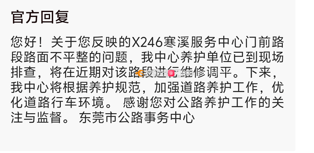 您好!关于您反映的X246寒溪服务中心门口路段路面不平整的问题,我中心养护单位已到现场排查,将在3月21日前对该路段进行维修调平。 感谢您对公路养护工作的关注与监督。 东莞市公路事务中心