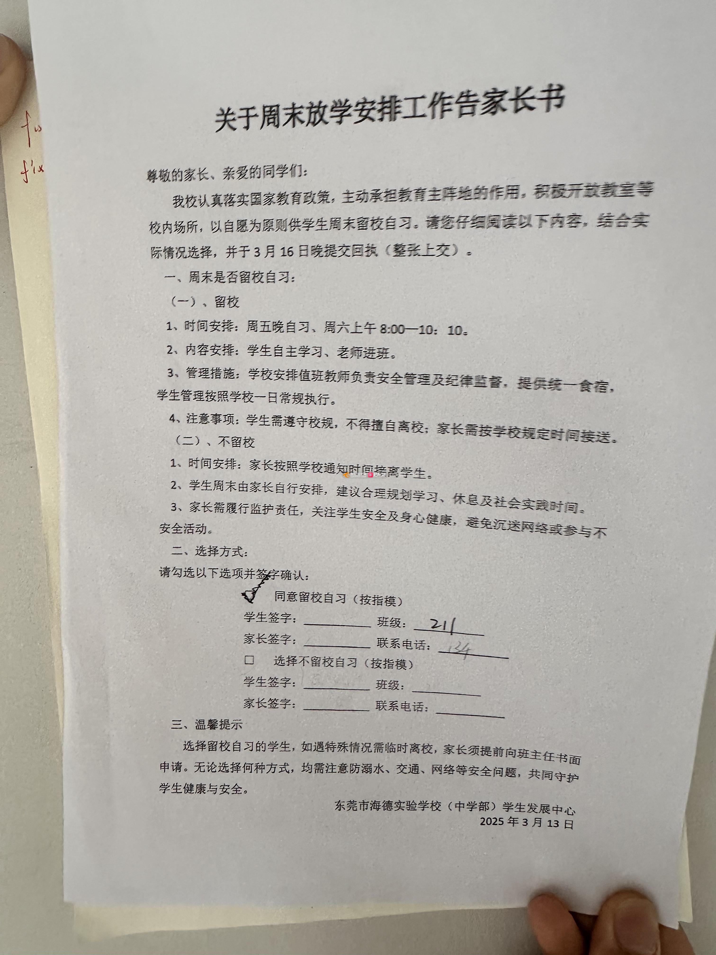 海德实验不履行国家双减政策,给予学生自愿留校签名书。并与校车集团合作。不将校车调整至周五。只将校车调制周六。不坐校车需自接导致家长无法接送。周六上课无自习间接强迫家长选择周六回校。且要求家长在班群接龙不是学生本人意愿