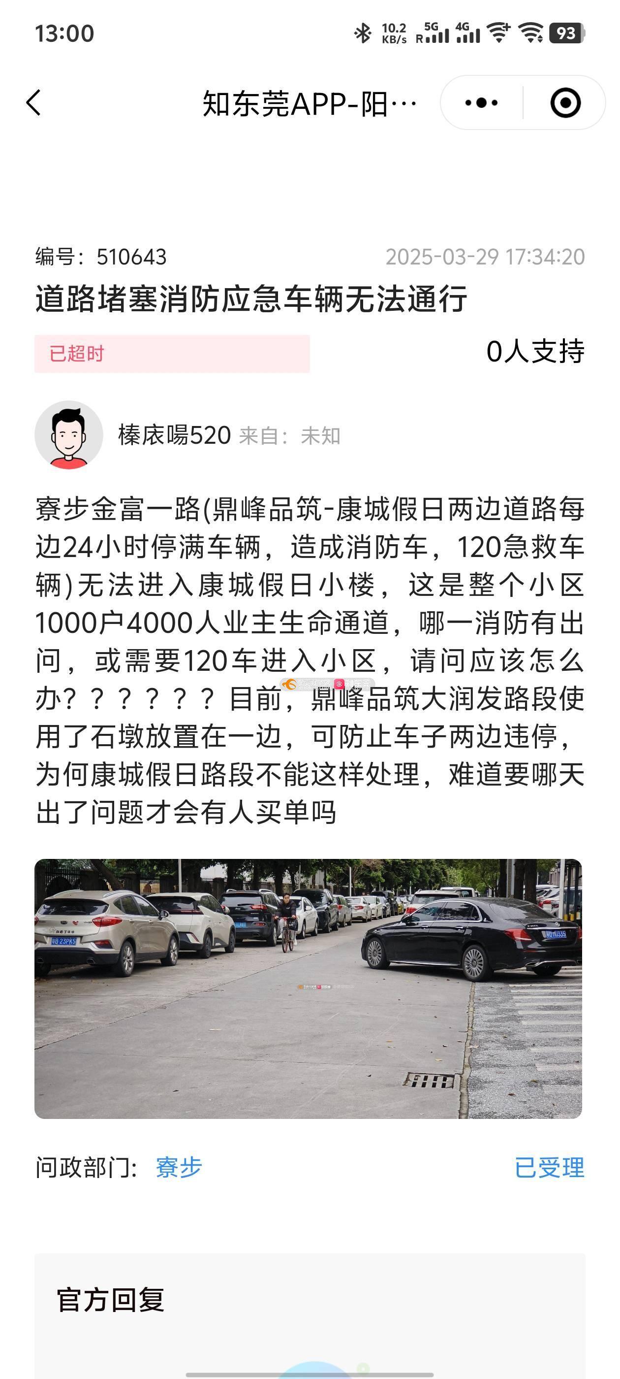 尊敬的市民,您好!您反映的问题已收悉,现回复如下:经查,情况属实。由于该路段小区楼盘较集中,且小区内停车位配置紧缺,部分住户将车辆停放在道路上,导致出现车辆停放比较突出。交警大队曾多次安排执勤人员对该路段违停车辆进行劝导及整治,后已安排一辆装有车载抓拍系统的警用摩托车在该路段巡逻,对违停车辆违法图片上传系统。下一步,将继续安排执勤人员加大巡查整治力度。消防大队工作人员于2025年4月24日到现场核查,发现有小部分汽车堵塞消防通道,第一时间告知华南城管理中心负责人和小区物业负责人,对于车辆乱停乱放现象,堵塞消防通道的行为进行管理和劝阻,让他们及时联系车主挪车,并加强日常巡查和管理 ,避免类似情况再次发生。消防大队工作人员要求华南城管理中心负责加强消防安全巡查、检查,加大消防宣传,确保消防通道和疏散通道保持畅通。如有疑问,请联系寮步消防救援大队,联系电话:0769-82399119。