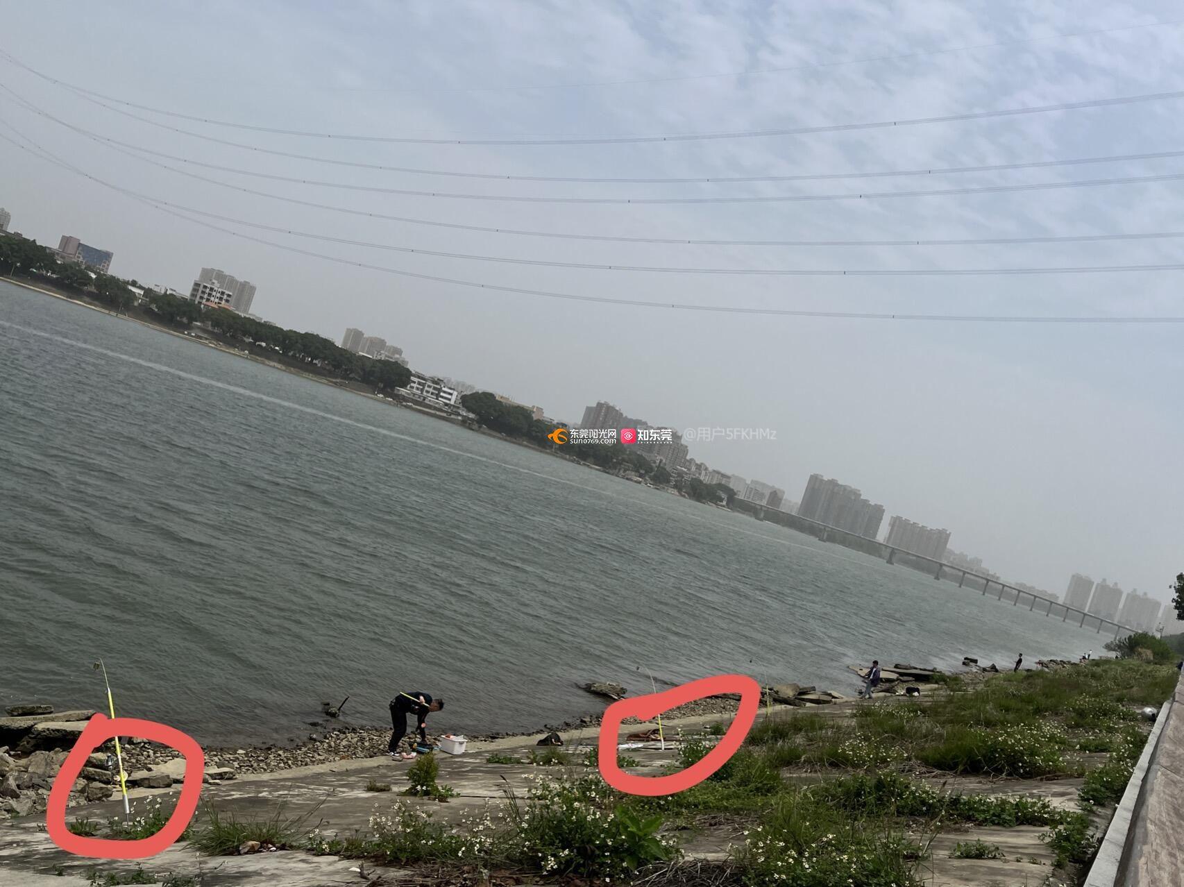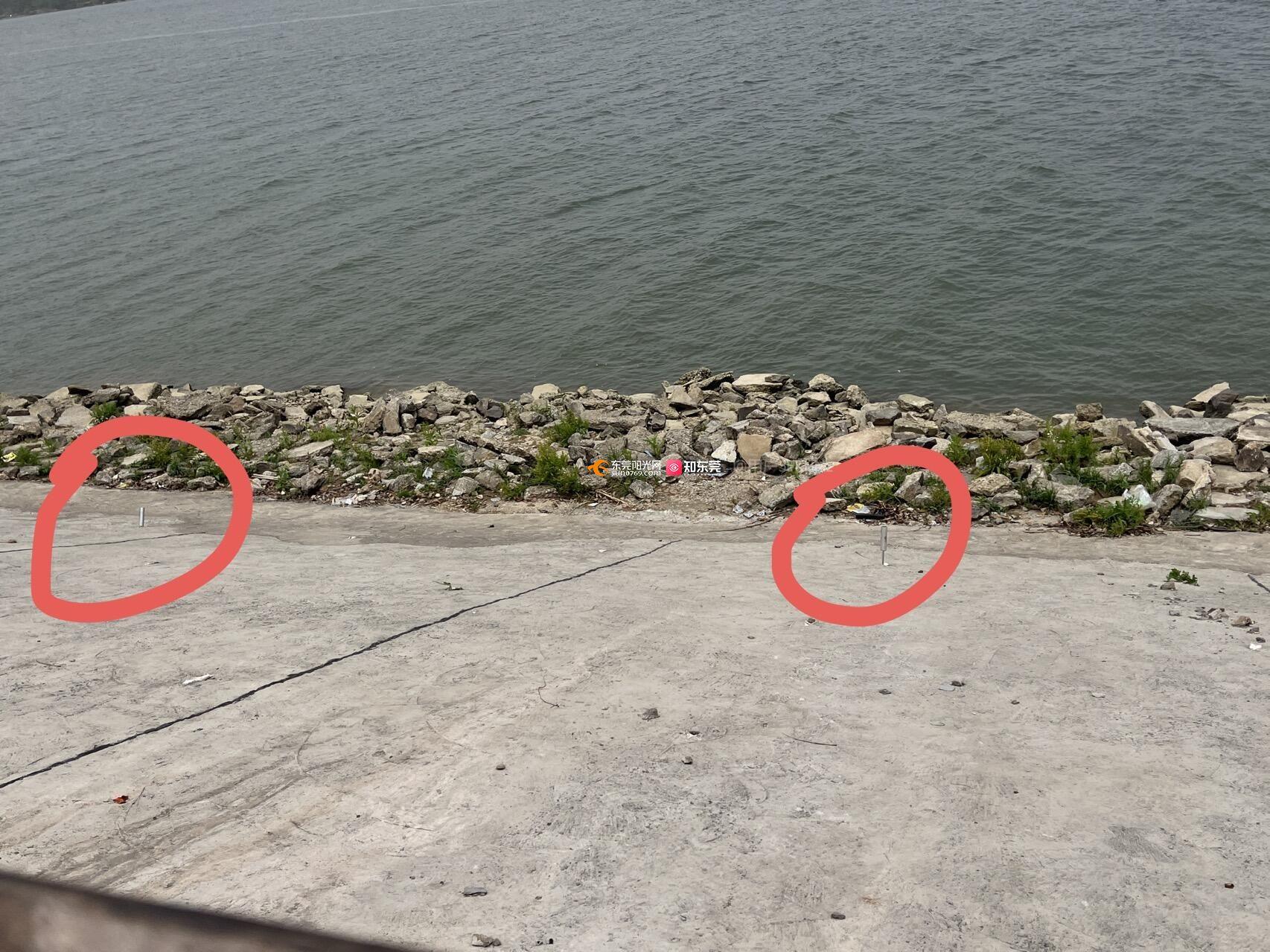 石排滨江体育公园东江堤边很多钓鱼的人将金属杆钉在堤坝上,造成很多创口,对堤坝造成破坏,会形成决堤隐患,引发洪发。