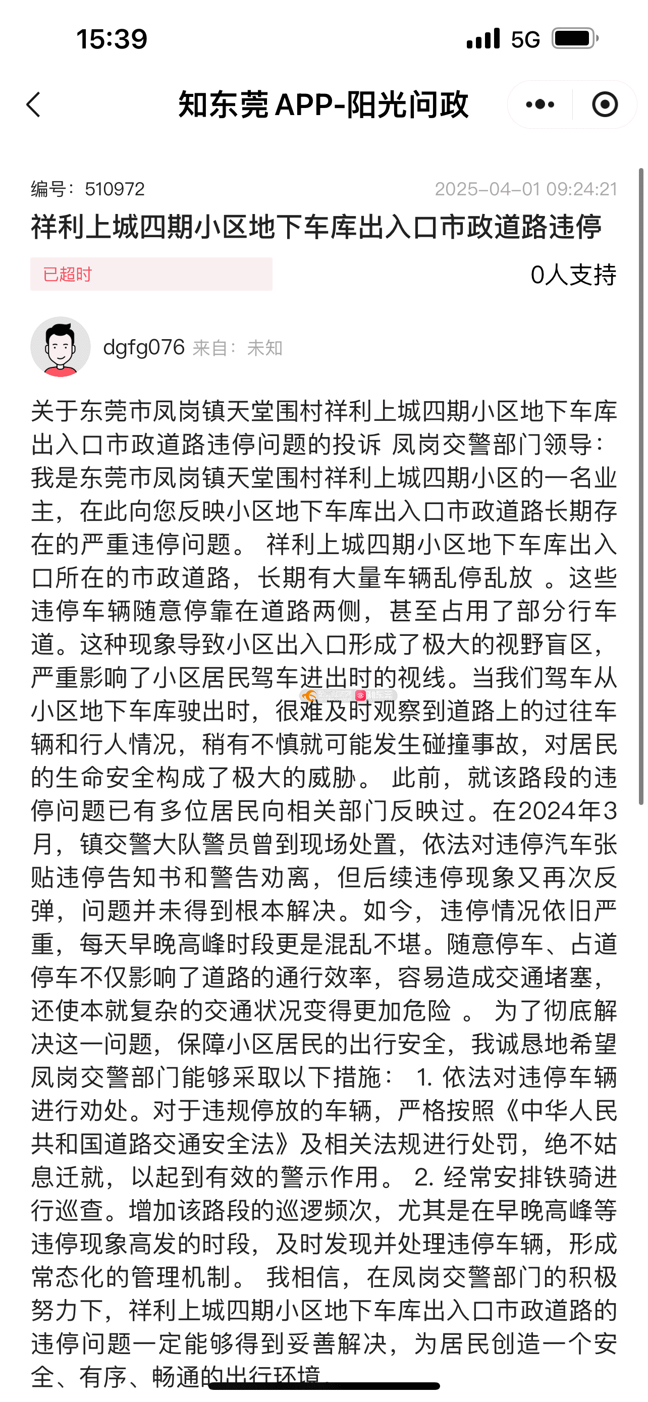 凤岗交警不作为,4月1日提交的投诉内容,今天已经4月16日了,超时不处理,凤岗镇天堂围村祥利上城4期小区出入口马路边还是一如既往的违停。有一台半挂车已经停了半个月了,存在严重的交通事故安全隐患。