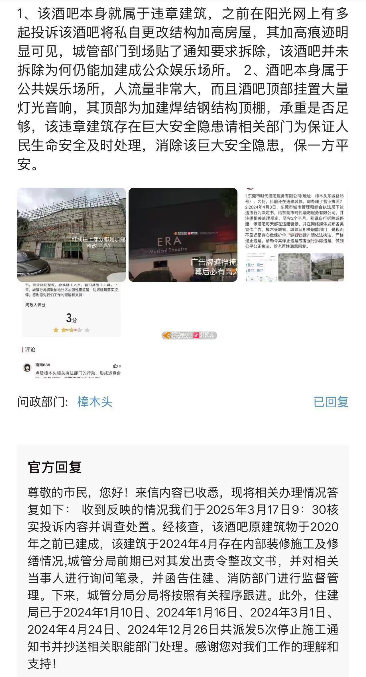 尊敬的市民,您好!来信内容已收悉,现将相关办理情况答复如下: 收到反映的情况后,城管分局于2025年4月28日9:30到现场核实投诉内容并调查处置。经核查,该酒吧原建筑物于2020年之前已建成,该建筑于2024年4月存在内部装修施工及修缮情况,我分局前期已对其发出责令整改文书,并对相关当事人进行询问笔录,并已对当事人作出限期拆除违法告知书。下一步,城管分局将继续跟进该案。 感谢您对我们工作的理解和支持!