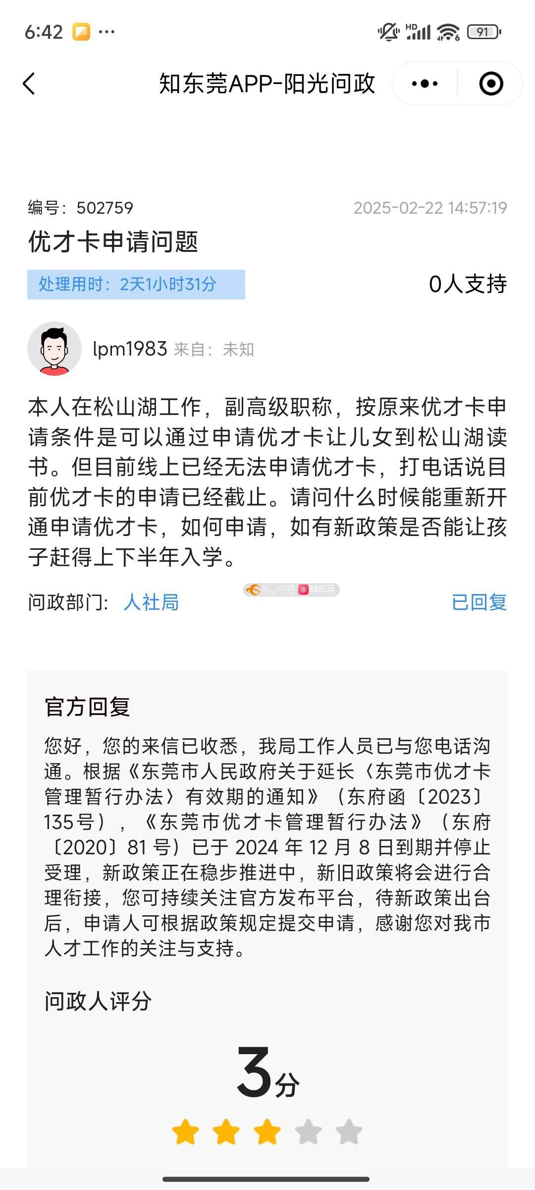 本人在松山湖工作,副高级职称,按原来优才卡申请条件是可以通过申请优才卡让儿女到松山湖读书。但目前线上已经无法申请优才卡,之前问政说目前优才卡的申请已经截止,会有政策衔接。请问有什么政策,如何申请,是否能让孩子赶得上下半年入学。
