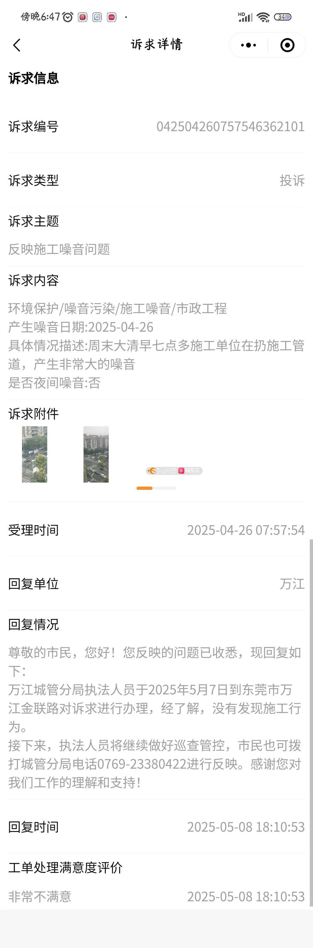 2025年4月26日早上七点多,道路施工噪音很大,所以当时就投诉了,2025年5月8日给我回复说没有施工行为。 现在路边还围着施工围栏呢,还在施工呢,区城管居然敢说没有施工,你就算想要敷衍,也不用这么敷衍吧 p1是4月26日拍到的正在施工的照片,p2是5月8日拍到的,还在施工的照片,p5是区城管给我的回复。 哪怕直接给回复我那个时间施工是合规的,我都觉得能接受,居然跟我说,没有施工行为