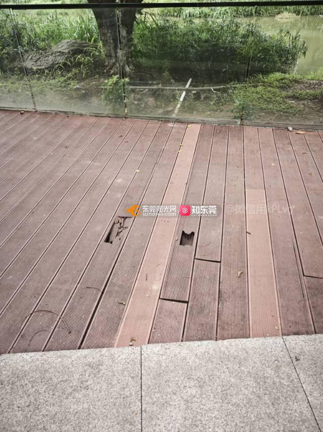 松山湖沟谷公园观光平台木地板损坏,具体地址:万科松湖中心三期后门对面观光平台