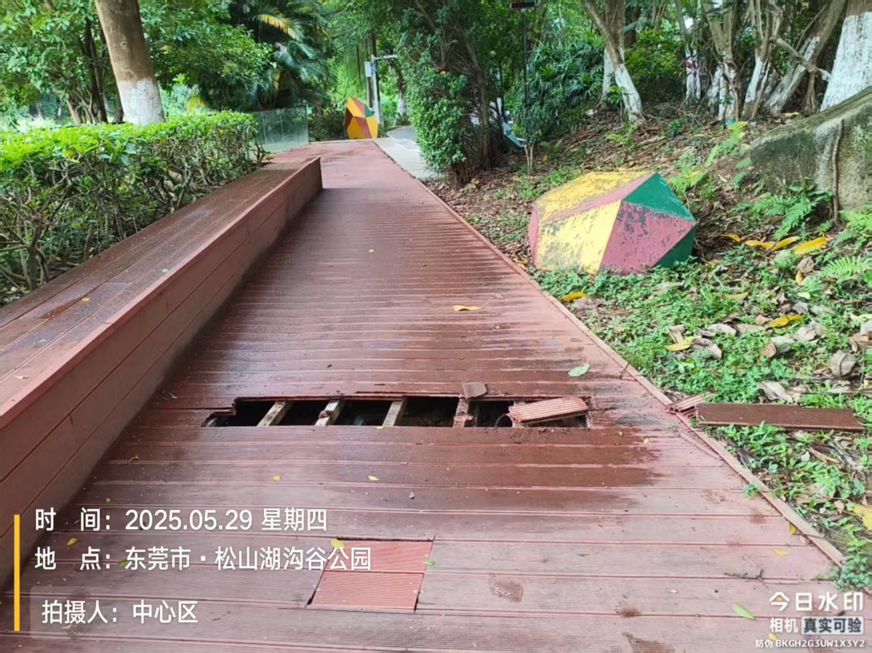 尊敬的市民,您好!阳光网热线平台转来《松山湖沟谷公园观光平台木地板损坏》的投诉一事收悉。非常感谢您对松山湖城市管理工作的关心和支持,关于您反映的松山湖沟谷公园木地板损坏的情况,我分局已于5月29日完成修复。造成不便之处,敬请谅解!下来,我分局将加大巡查和维护力度,及时发现和处理损坏的市政设施,保障市政设施完好安全运行。 欢迎广大市民关注、参与和监督园区城市管理工作,共同维护市政公共设施安全正常运行。 东莞市城市管理和综合执法局松山湖分局 2025年5月30日