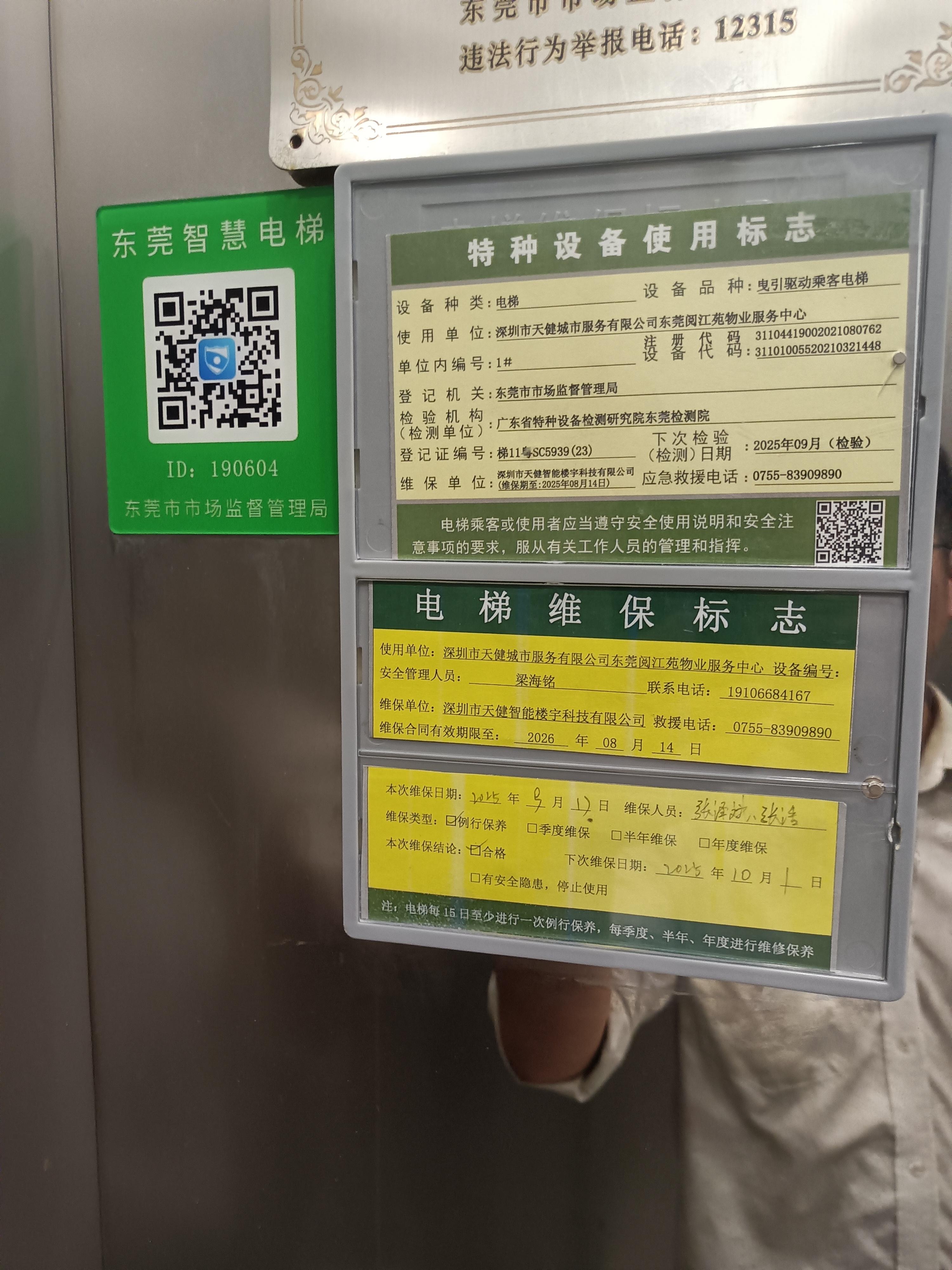 尊敬的市民,您好! 您反映的问题已收悉,再回复如下: 万江房管所反馈: 经向物业了解,该电梯空调出现故障,物业联系空调维修师傅进行维修,目前空调已修复,能正常使用。针对业主反映该电梯空调故障率比较高的情况,万江房地产管理所约谈了万江天健阅江来物业,要求物业公司正视该问题,积极寻求解决方法。物业表示接下来将联系专业空调维修师傅对电梯空调进一步进行检测,如发现存在问题及时整改,保障业主出行安全。如有疑问,请联系:万江房管所 ,联系电话:0769-22706086。 万江市场监管分局反馈: 经查,我局执法人员于2025年9月22日会同物业管理人员对天健阅江来4栋的电梯进行检查。电梯下次检验日期2025年9月(已检验),下次维保日期2025年10月1日。负责电梯保养的是深圳市天健智能楼宇科技有限公司,特种设备生产许可证有效期至2029年4月6日,负责保养电梯的两名作业人员持有特种设备作业人员证,均在有效期内。特种设备使用标志及电梯维保标志张贴在电梯显眼位置。符合相关要求,暂未发现其它违法行为。因电梯维保记录单需做档案保存,如需查阅或复印公示,请与物业管理公司协调。电梯内的空调机,是开发商安装完电梯后加装的,现由物业公司负责管理,电梯出厂安装后,外设加装的设备,不在我局监管范围。经了解,空调机现已修理好,正常运行。现场督促物业管理处人员加强管理,做好与业主的沟通工作,通知维保人员认真履行电梯保养工作,细致做好每项电梯保养项目。 如有疑问,请联系:东莞市市场监督管理局万江分局,联系电话:0769- 22281517。 坝新社区反馈: 经向天健阅江来小区物业服务中心核实,关于电梯空调故障问题,物业已第一时间联系维修人员到场检修。目前,该电梯空调已完成修复,可正常运行。 另外,对于您反馈的电梯空调故障率较高问题,社区已向物业明确要求,必须严格依照国家及地方相关法律法规与特种设备管理规定,将电梯的维修保养工作交由具备合法资质的专业电梯维保公司负责,以从根本上保障设备运行稳定性与居民使用安全。据物业方反馈,当前负责该小区电梯专业保养的单位为深圳市天健智能楼宇科技有限公司。电梯轿厢内显眼位置,已按照特种设备管理相关规定,规范张贴《特种设备使用标志》《电梯维保标志》等法定标识,标识信息完整、清晰,可供居民随时查阅,完全符合特种设备安全管理要求。此外,电梯维保记录单需按规定做档案保存,若您需查阅相关记录,可直接与物业服务中心联系对接。 如有疑问,请联系万江街道坝新社区居委会,联系电话:0769-28638972。 感谢您对我们工作的理解和支持!