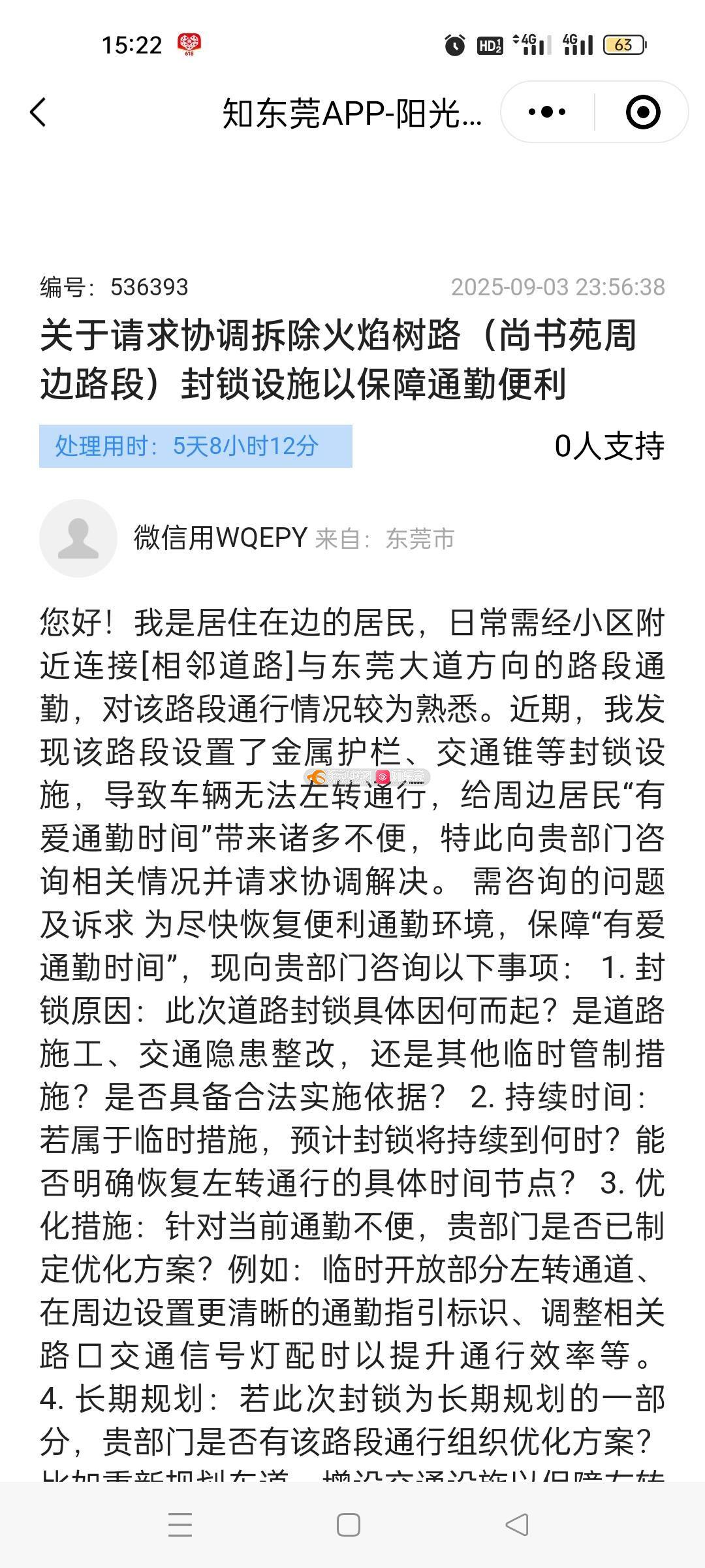 尊敬的市府帮、东莞市公路事务中心及相关部门: 您好! 我是东莞东城尚书苑小区附近居民,日常频繁途经东莞大道尚书苑路段。现该路段拟设永久围栏并维持全方向禁左转,严重影响周边居民通勤,特提出“分车道差异化左转管理”建议,具体如下: 二、优化方案:分车道差异化左转管理(兼顾秩序与便民) 结合该路段交通流量特征(早高峰东向西左转需求旺盛,西向东左转需求较弱),建议取消“永久围栏”计划,实施“分车道划定左转权限”的精细化管理方案,具体如下: (一)核心管理规则 - 开放左转车道:保留东向西方向(尚书苑一侧)的最左侧车道为“早高峰专属左转车道”,开放时段为工作日7:00-9:00、17:00-19:00(平峰期该车道可兼作直行车道,提升车道利用率); - 限制左转车道:西向东方向(东莞大道主路一侧) 全天禁止左转,车辆需沿东莞大道直行至八一路交叉口掉头(该方向日常左转需求仅为东向西方向的1/5,禁左转对整体出行影响极小)。 交通管理的本质是“以人为本”,东莞大道尚书苑路段的规划不仅关乎路面秩序,更直接影响周边数千居民的日常生活品质。相信通过“差异化左转”的精细化管理,既能保障交通有序,也能真正实现“便民服务”的初衷