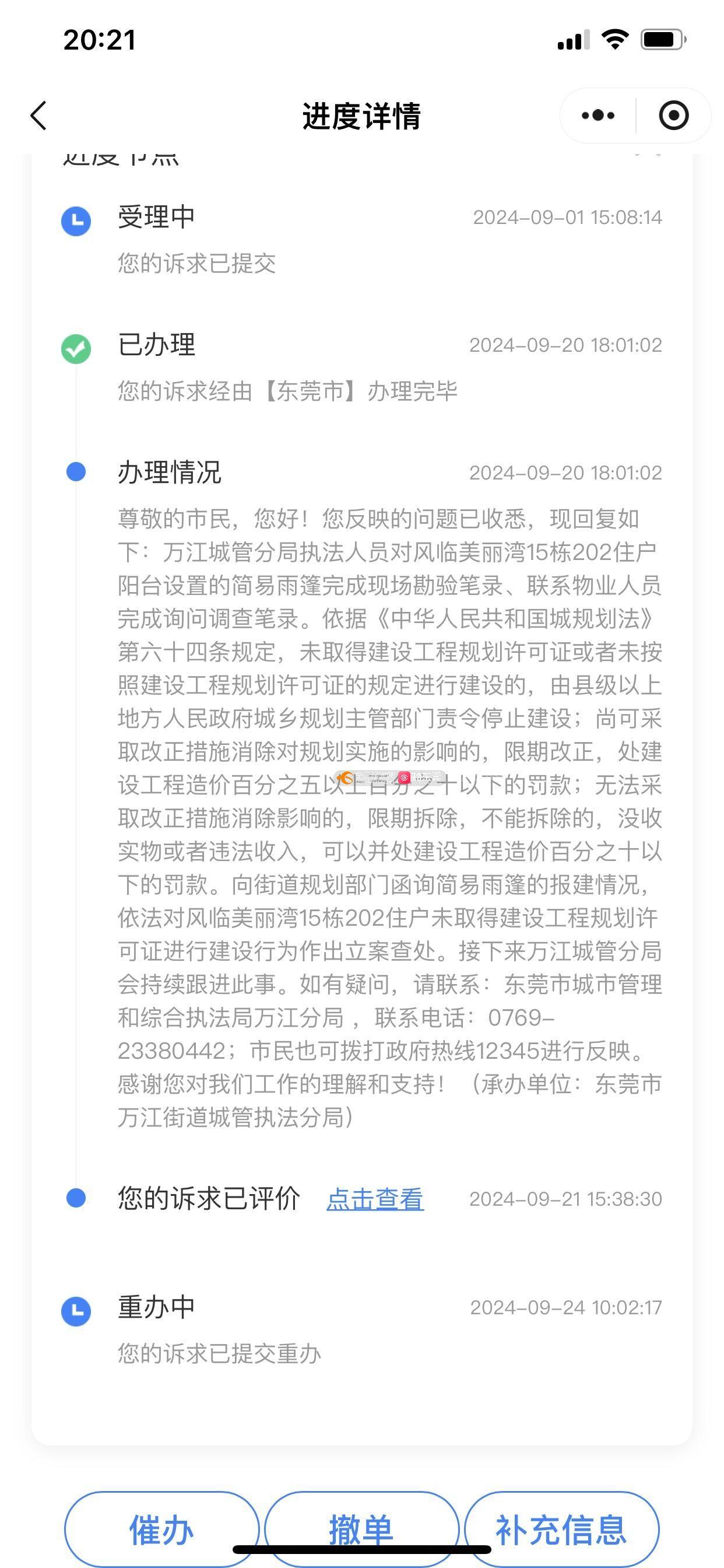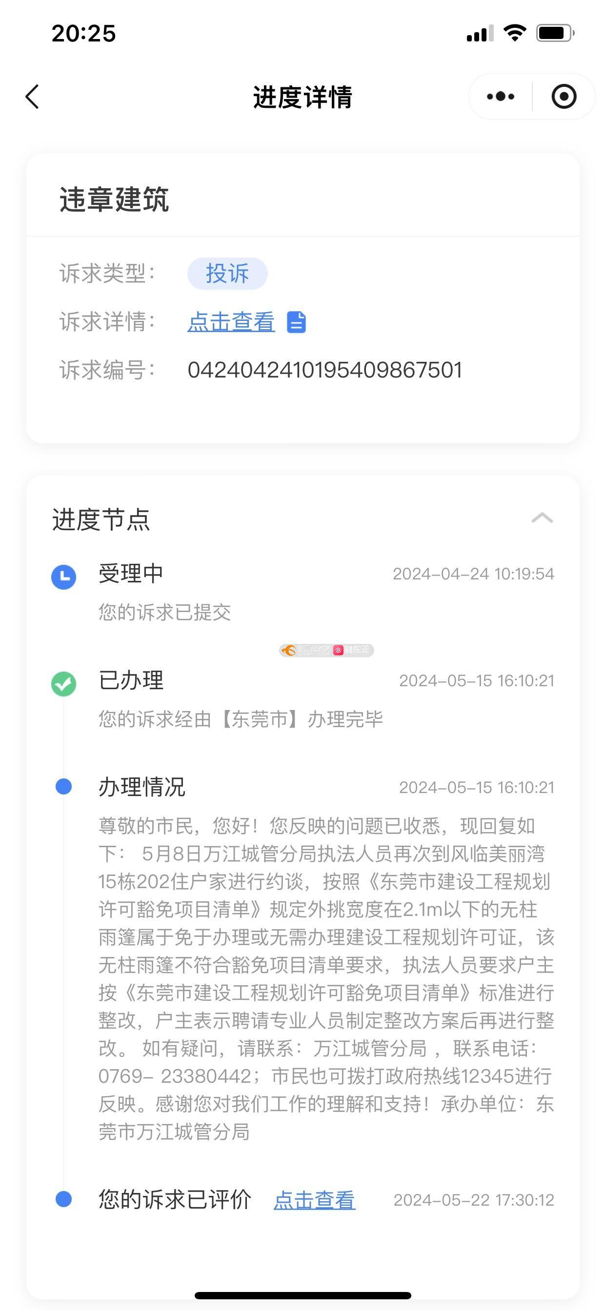 东莞市万江街道风临美丽湾一期15栋202房违规擅自拆除自家阳台,改为客厅,改变房屋结构,扩建大型钢结构有柱琉璃雨棚,从2023年10月刚开始建还没有建好家人就向物业东莞12345反映至今没有得到有效解决,2023年所回信息都有保存,相片也有日期,相关部门乱说,包庇,还说是合法的。2023年就说限期拆除,直至2025的今天还是限期,限期在相关部门就是无限期,过几个月又会说换别一个人负责,公平,公正在哪里,更离谱的现在说当事人情绪激动不管了,我想问问这样子是不是就可以****,为什么不按法律程序处理,难道需要打中央巡视组的电话反映吗?媒体需要这些证据都可以提供,打0769-23380442话询问也推脱说他只是个办公室,有录音。违建面积也远不止12平方米。我想问下相关部门什么时候才能公平、公证的处理好,两年时间了。每次都是草草了事,不是说事件复杂性,就是手续繁锁。