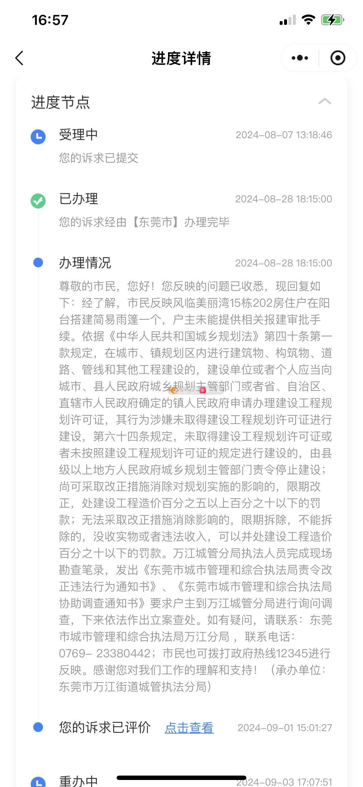 尊敬的市民,您好!您反映的问题已收悉,现回复如下:经核查,我分局再次联系涉事业主进行违建拆除工作,考虑到涉事业主对此事情绪反应激动,为避免引发安全意外,属地社区从稳妥处理的角度出发,建议先由物业管理方及属地社区共同与当事人深入沟通协调,此前沟通中,当事人已表达将雨棚改建为移动雨棚的意向,目前因尚未找到合适商家上门实施改建,需一定时间推进协商。目前,分局工作人员已就此事与属地社区对接,督促社区加快沟通协调节奏,积极搭建对话平台,推动双方就雨棚改建及结构恢复等事宜达成共识。如有疑问,请联系:东莞市城市管理和综合执法局万江分局 ,联系电话:0769- 23380442。感谢您对分局工作人员工作的理解和支持!