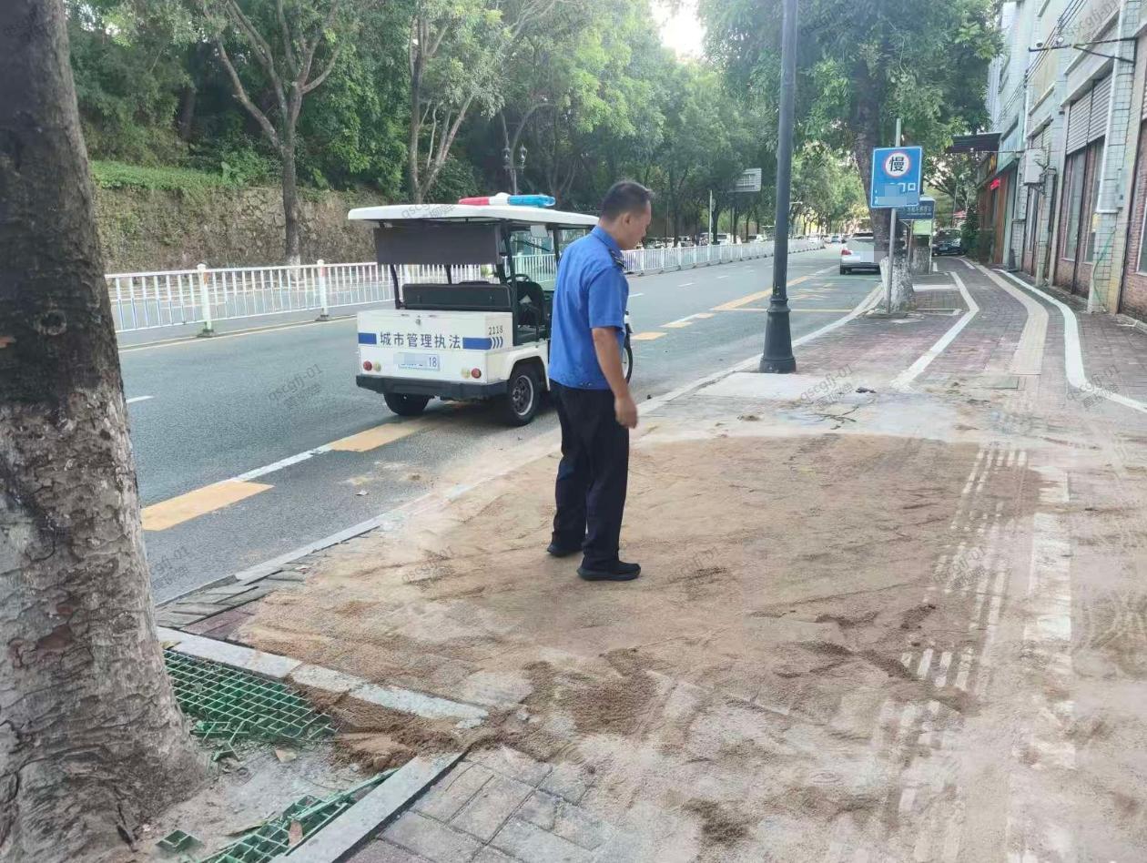 砂石乱堆积人行道,车辆横停人行道