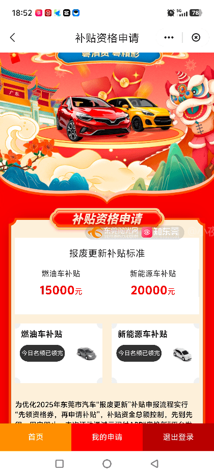 本来看着国补报废车有补贴才换车的,因为等车时间长了点,销售告诉我东莞也要抢资格,10月1号就是图片这情况,我旧车已经报废了,新车也开完发票上牌了,现在告诉我要抢?而且一个月才一次?知道这样子我都不买车了,老百姓伤不起。