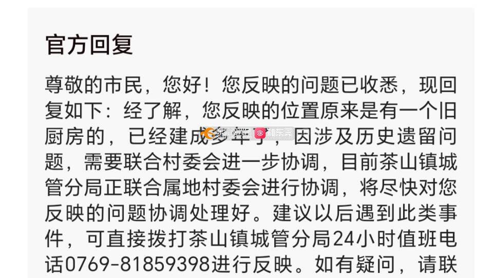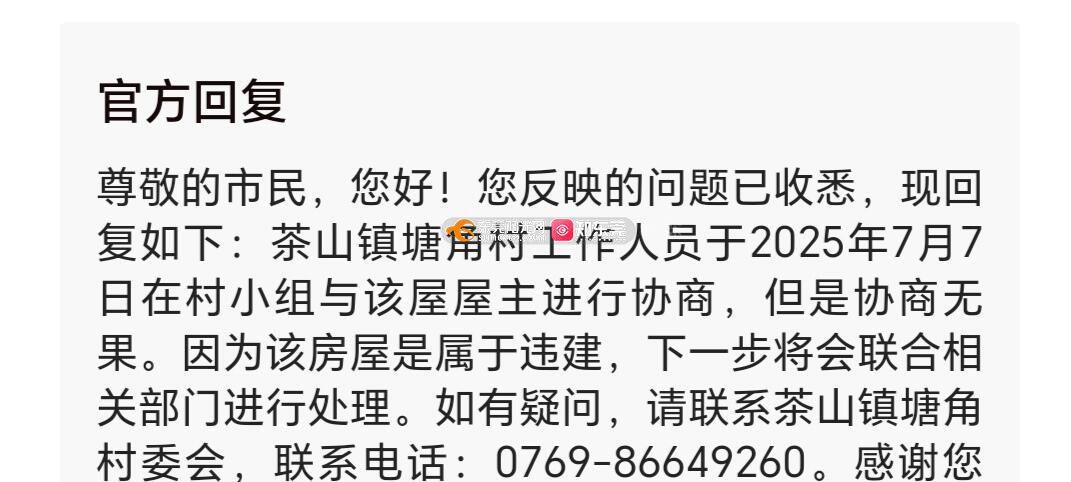 地址:茶山镇塘角塘一村民小组 多次举报无果,最后一条官方回复将尽快协商处理好?即什么时候→拆 由二月份投诉到十月份,屋主明知违建都要建,现在明言不用拆,执法部门光拿工资不办实事,作为在哪,其它镇街办事为何那么强图一,执法部门依法依规才是硬道理,历史遗留不用报建直接施工重建,还有官方谁说翻新?重建说翻新,有包庇成份。未按图纸施工部分尽快拆除 @茶山镇城管