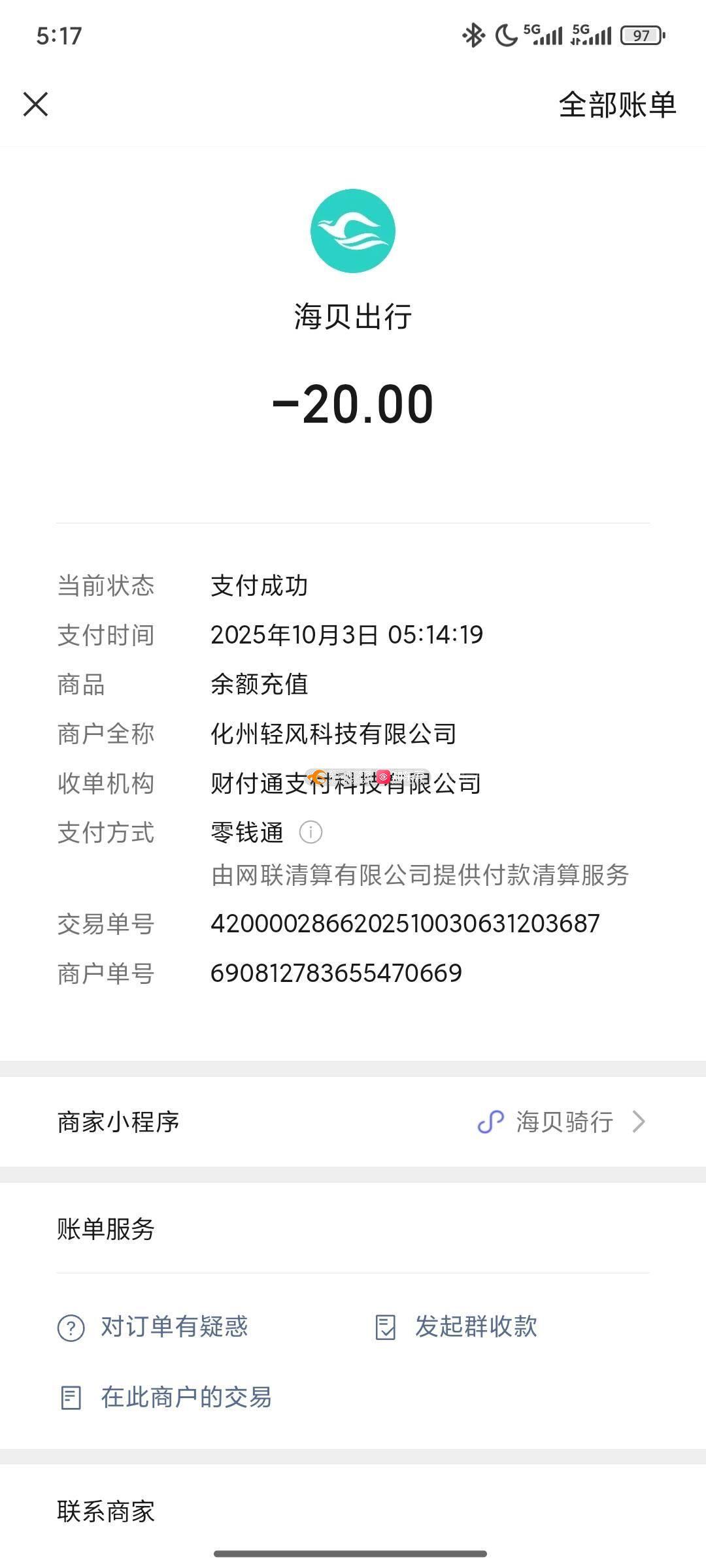 虎门海贝骑行必须要充值20后才可以结账