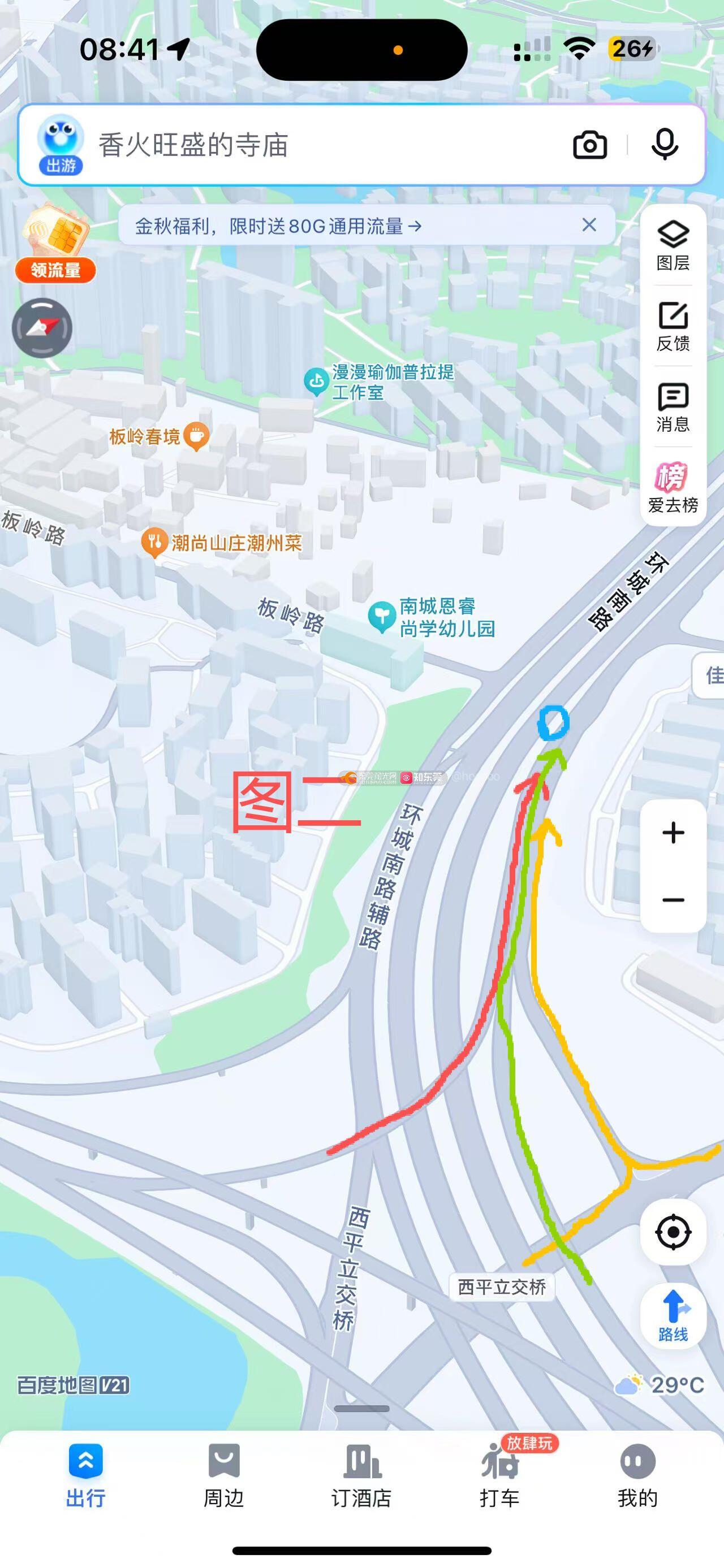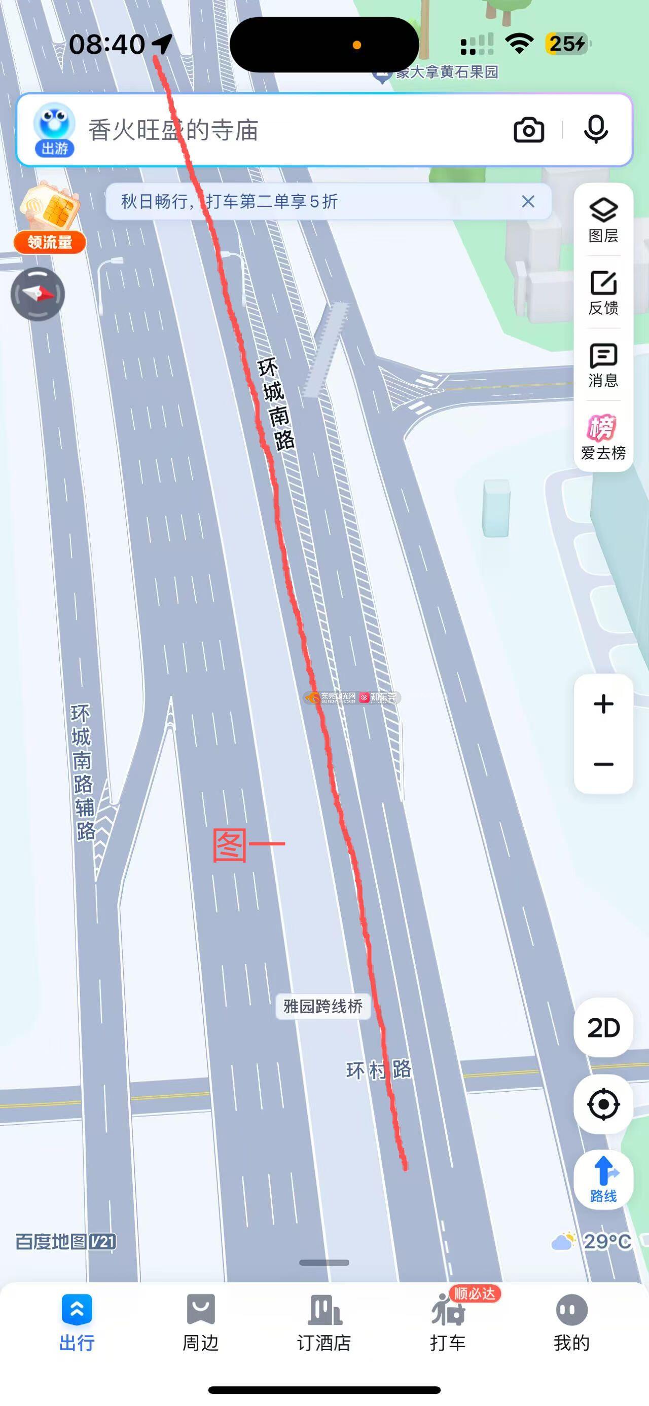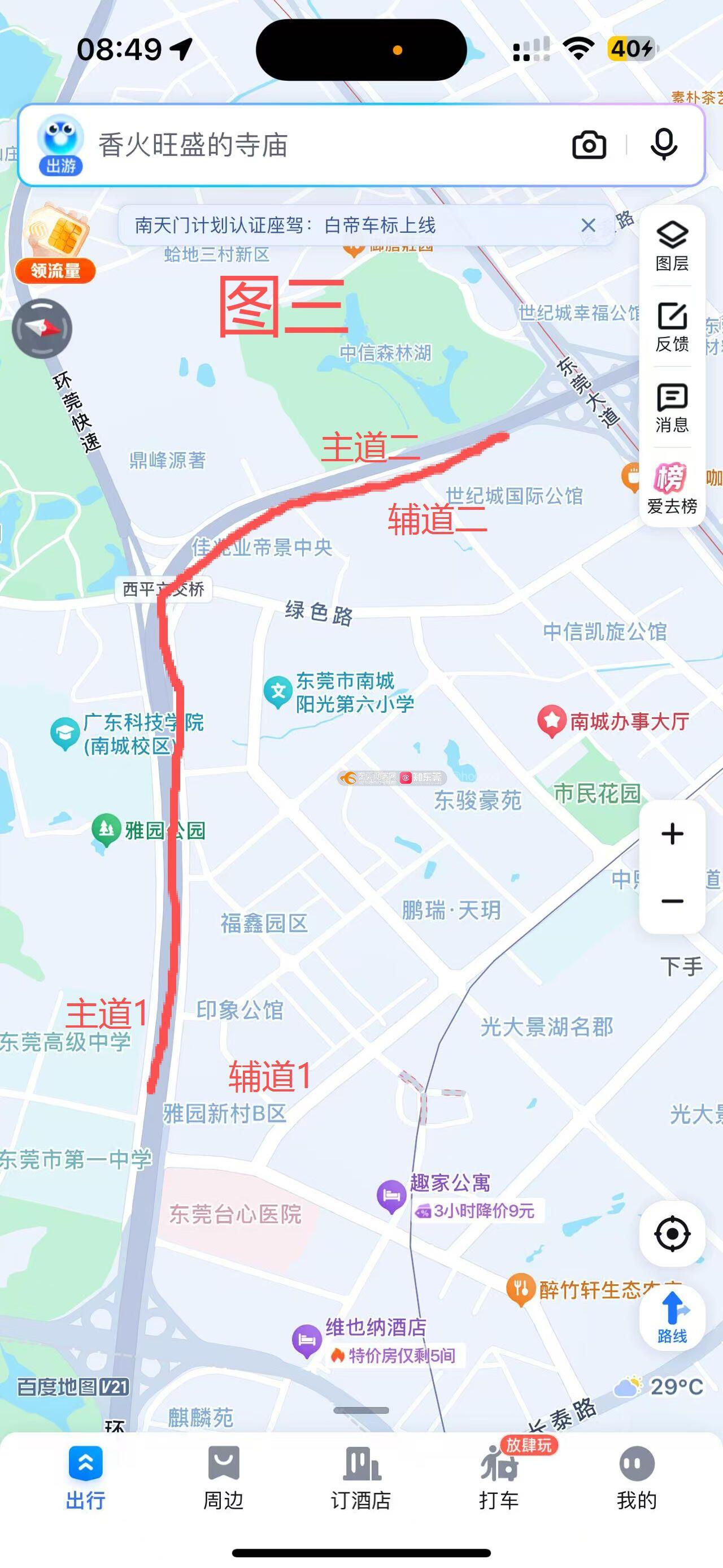 见图三,因为环城路松山湖-中堂方向,下午开始就会堵车,每天都是,想一直走主道走,主道1的位置是必堵的,过了主道1,就有所缓解,要想避开主道1的拥堵,就得在辅道1的位置提前进辅道1,但是这样也不见得能避开拥堵,毕竟辅道2的位置,是有三条车流共同汇入(见图二) 。所以,现在走环城路,无论是走主道辅道,都必须堵,所以,我以我自己的见解,给出一下建议:1、看图二,把环莞快速汇过来的红色流向,在蓝色圈圈位置,提前把环管快速的车流开个口,提前并入到环城路主路上(汇入口需加装限速抓拍以保证安全汇入且不影响环城路主路车辆行驶),因为前面拥堵会导致西平立交下面的几百米的环城路是很少车流的,这样就能缓解图二中的三向车流(环莞快速+绿色路+环城路辅道)造成的拥堵。2、我看到在近期环城路-西平立交处做出了调整,效果还是有的,但是不明显,希望在图一处,就是一直保持直行的两车道改为虚线,这样通性更强,因为占着快车道跑50、60码的,打高灯闪鸣笛都无动于衷的,比比皆是,所以同样是直行,把实线改为虚线,车辆就能变道超车,就能从根源缓解拥堵。以上是纯个人见解,希望对缓解拥堵有用,希望有关部门能参考一下[抱拳]
