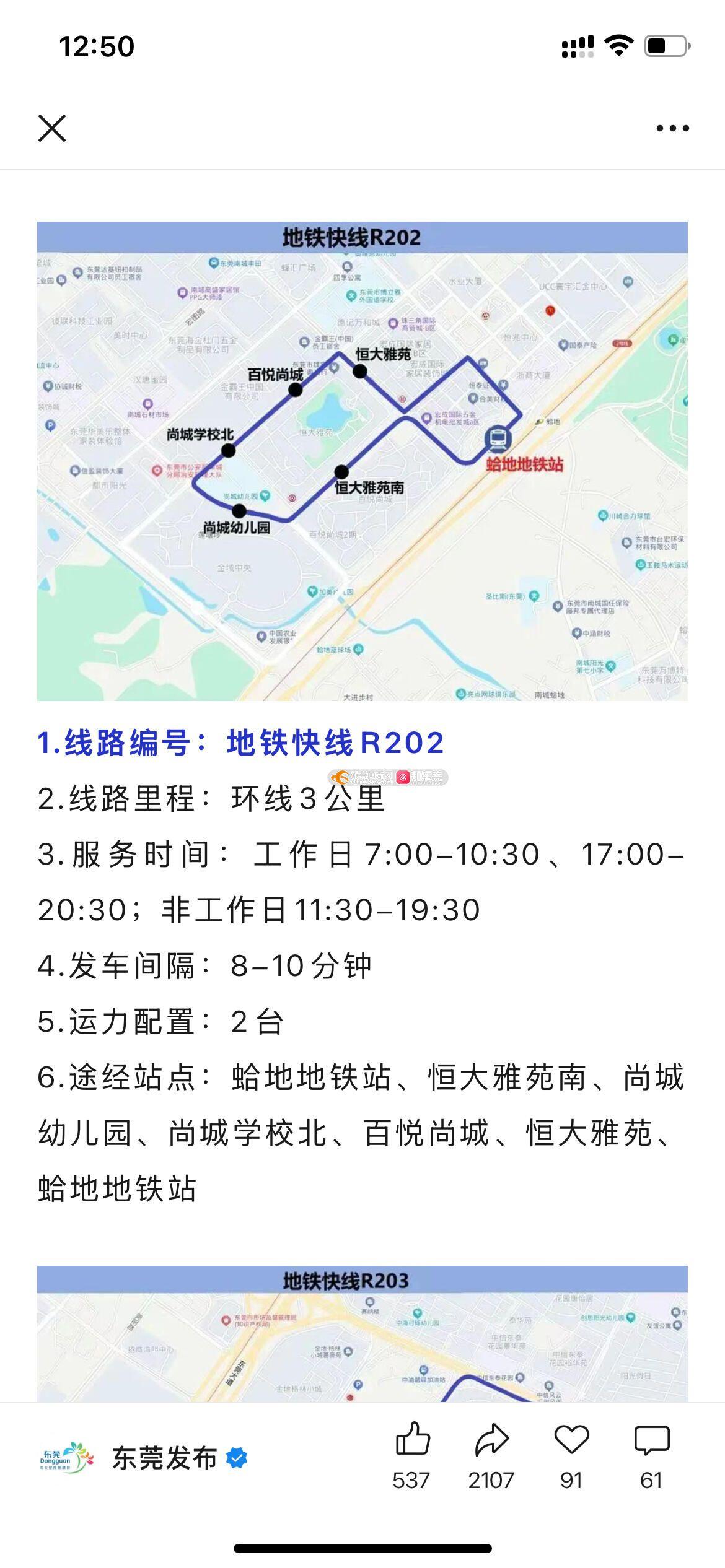 9月29日起东莞试点开通首批10条“地铁快线”接驳轨道交通2号线主要站点,大家都为这个点赞👍。关于蛤地地铁站建议增加一条线,由于主干道宏图路两边很多小区,例如有香树丽舍、万科金悦香树、漾城、精英名都等;产业园也有好几个,高盛科技园、南信产业园、聚大电商产业园、宏蓝途科创园、蜂汇广场等,这些居住小区和产业园都对接驳蛤地地铁站的“地铁快线”都有很大需求,所以建议主管部门可以深入调查,增加一条宏图路到蛤地地铁站的“地铁快线”。 以上,谢谢!