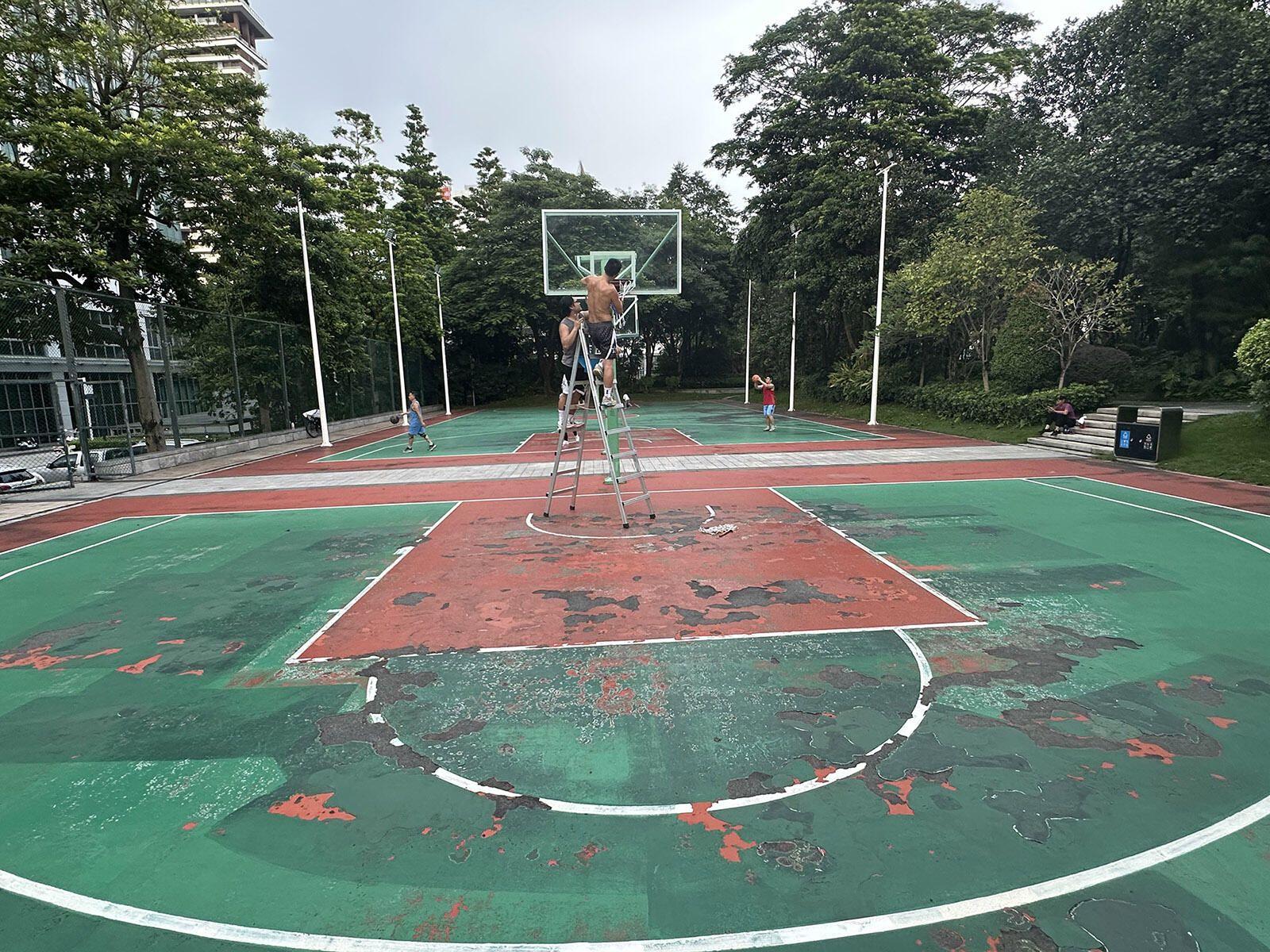 东城岭南园林大厦后面篮球场地面可以翻新吗?已经几年没有翻新了,球场地面破损不平整,打球容易扭伤,晚上打球的人比较多,希望能补平翻新,东莞越来越美好!