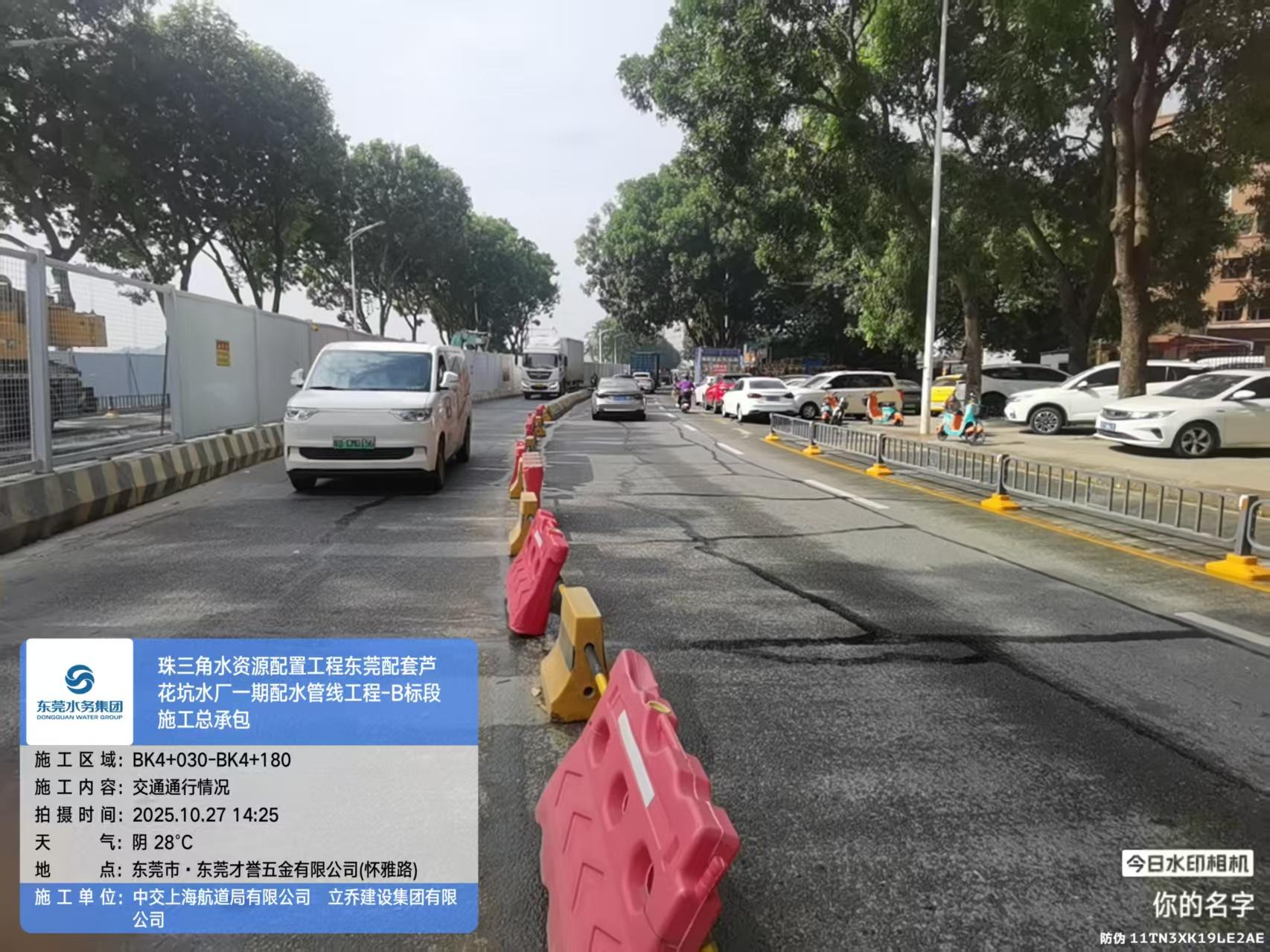 尊敬的市民,您好!您反映的问题已收悉,现回复如下: 收到反映的情况后,我们于2025年10月15日07:43电话与您取得联系,并对诉求进行办理。您反映问题的工程为东莞市水务环境投资控股集团建设管理有限公司(下称“建设公司”)负责代建管理的珠三角水资源配置工程东莞配套芦花坑水厂一期配水管线工程-B标段。施工单位为中交上海航道局有限公司和立乔建设集团有限公司。 经了解,您反映的路段目前正在进行自来水管道铺设工程,施工单位已按规定办理了占道施工许可,该路段预计2025年12月底完工并开放通行。为缓解上下班高峰期间该路段交通压力,施工单位在高峰时段安排一名人员在现场指挥疏导交通,减少对车辆通行的影响。接下来,建设公司将持续关注该路段交通状况,及时优化调整疏导措施,并督促施工单位进一步加强安全文明施工管理,在确保工程质量和安全的前提下,全力加快施工进度,最大限度隆低对市民出行的影响。关于您反映未见工人动工的问题,是因该路段为封闭性施工,为保护行人安全及施工进度正常实施,施工人员每天在围挡内部施工,施工期间给您造成不便,敬请谅解。 2025年10月17日,工作人员致电告知您上述情况。如有疑问,欢迎致电水务环境集团24小时客服热线96968,感谢您对我们工作的理解和支持!