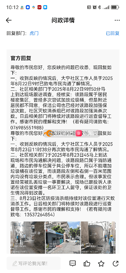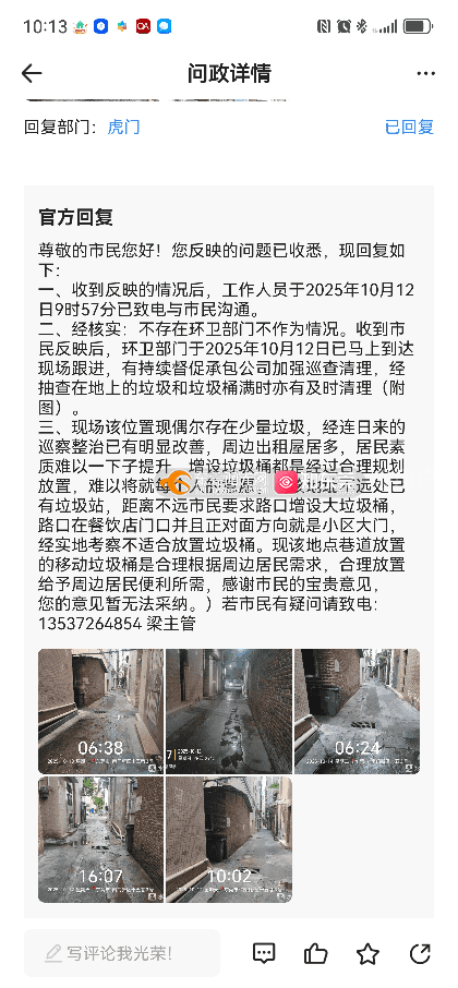 尊敬的市民,您好!您反映的问题,工单编号28101011105893801,虎门大宁社区已作出答复,尊敬的市民您好!您反映的问题已收悉,现回复如下: 一、收到反映的情况后,工作人员于2025年10月12日9时57分已致电与市民沟通。 二、经核实:不存在环卫部门不作为情况。收到市民反映后,环卫部门于2025年10月12日已马上到达现场跟进,有持续督促承包公司加强巡查清理,经抽查在地上的垃圾和垃圾桶满时亦有及时清理(附图)。 三、现场该位置现偶尔存在少量垃圾,经连日来的巡察整治已有明显改善,周边出租屋居多,居民素质难以一下子提升,增设垃圾桶都是经过合理规划放置,难以将就每个人的意愿。(该地址不远处已有垃圾站,距离不远市民要求路口增设大垃圾桶,路口在餐饮店门口并且正对面方向就是小区大门,经实地考察不适合放置垃圾桶。现该地点巷道放置的移动垃圾桶是合理根据周边居民需求,合理放置给予周边居民便利所需,感谢市民的宝贵意见,您的意见暂无法采纳。)若市民有疑问请致电:13537264854 梁主管。本次诉求您未提出新情况、新理由,根据《东莞市政务服务便民热线管理办法》第十条 不受理事项:(七)正在办理或者办理完毕,诉求人无新情况、新理由仍以同一事实、同一理由重复提出同一诉求事项(含承办单位认定终结办理的事项),告知诉求人办理进展或者办理结果。