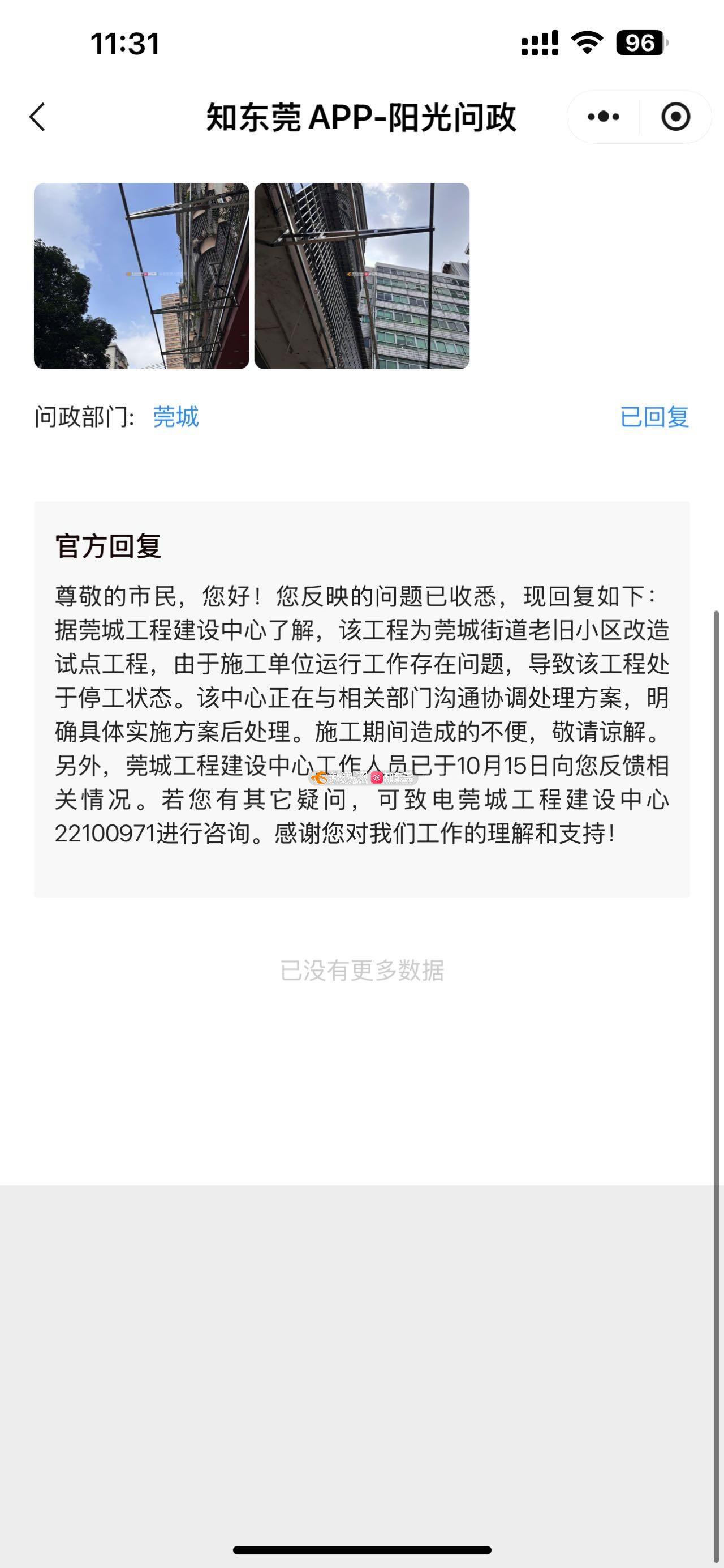 位于向阳路10号怡发商场的雨蓬由莞城建设中心由开工旧改到改完后剩下的烂尾一句电话讲已经和旧改公司取消合同至于什么时候把烂尾的工程完工没有了结束的时间……望有关政府部门着意现时莞城的经济发展……不能老是一句话就忽悠拖了事……开工时有关部门工作人员拍心口,结束后剩下全是问题和烂尾……