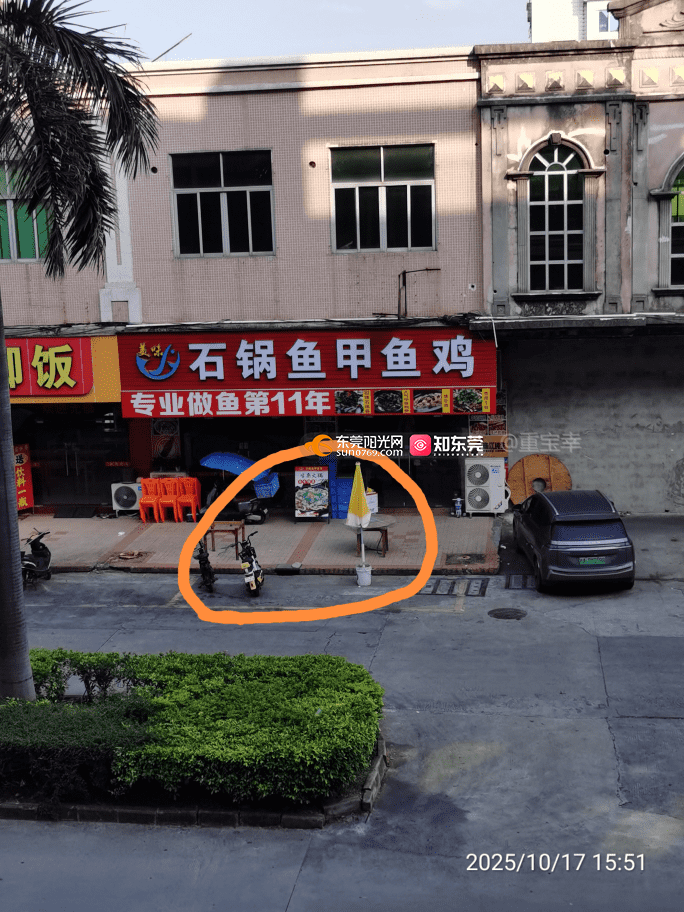 石排镇石崇工业园石锅鱼甲鱼鸡店铺,从开业以来长期利用电动车水泥桶遮阳伞恶意霸占停车位,只要是没在这店铺消费,任何电动车汽车都不能停在停车位里面,停车位属于公共资源,这家店铺谁给他的权力把路面停车位占为己有,请相关部门依法查处,谢谢!