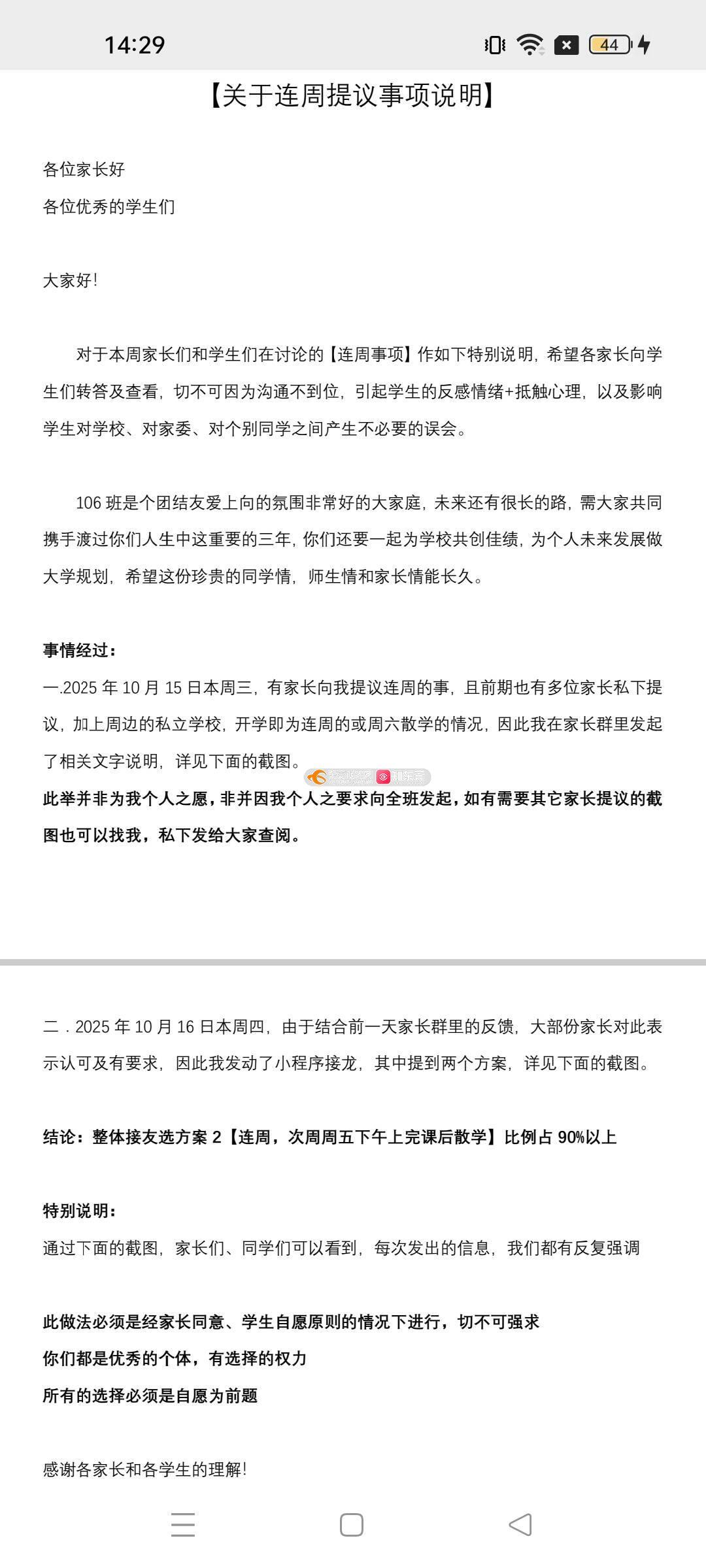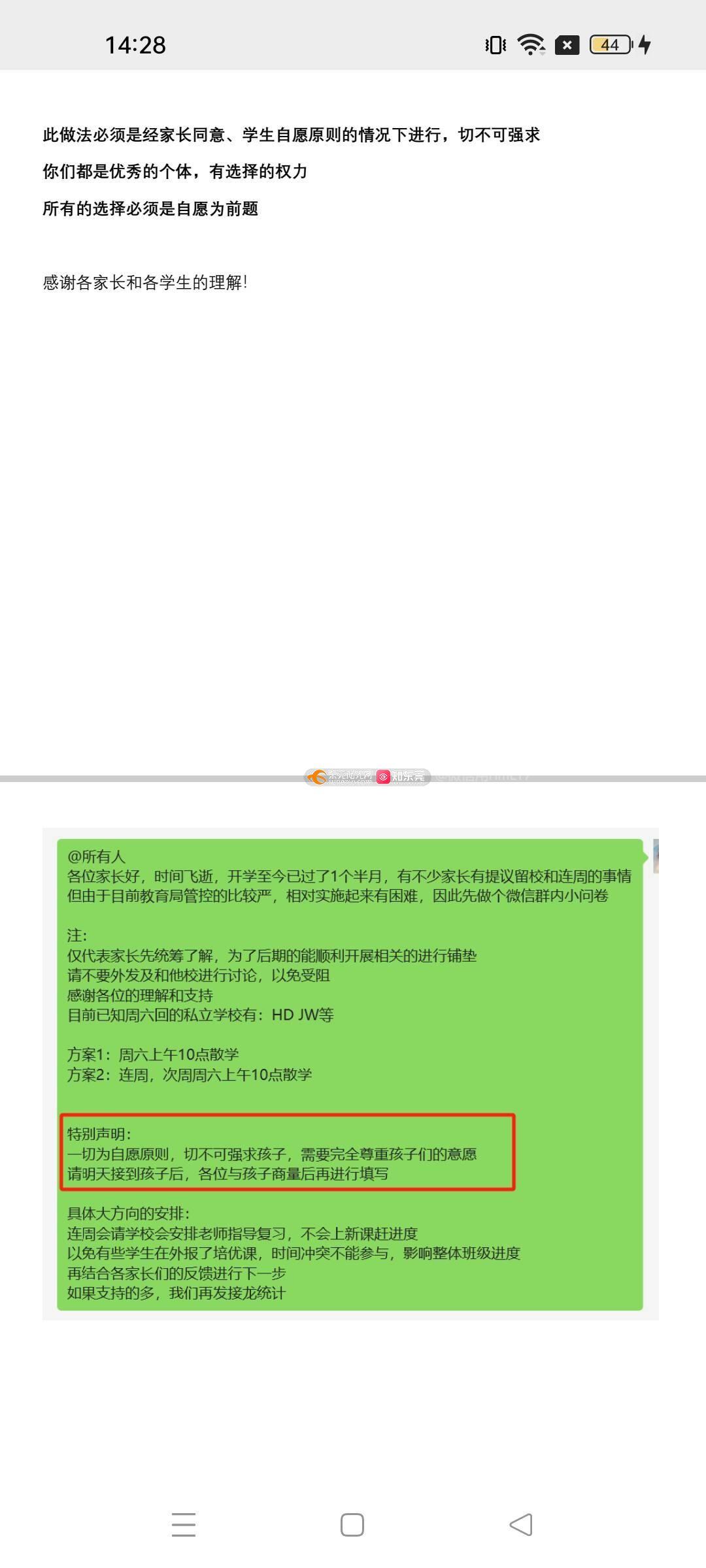 北辰中学谎称家长提议,实行联周制度,要求学生上到第二周才能放学,即上两周学放一个周末假。并且以学生自愿的名义,实则强制学生签署自愿申请书。