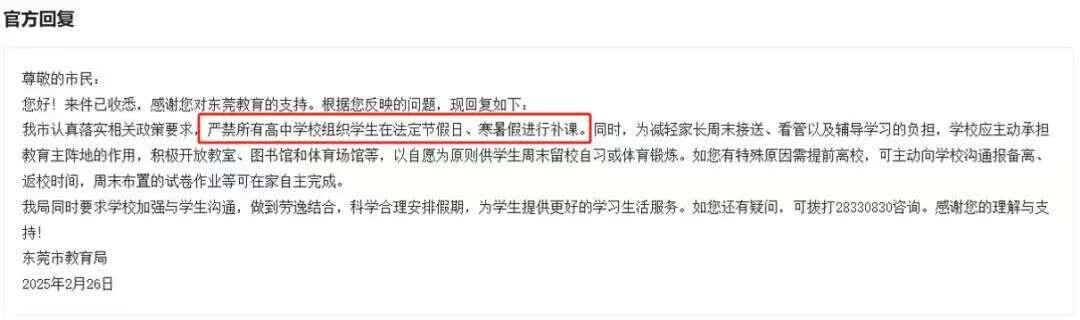 为什么翰林高级中学不能像其他学校一样高三生不是每周末都可以放假 政策明文规定是每周末单休 高三可单休,允许学生自愿返校自习但禁止讲授新课。但是翰林高级中学说是学生自愿留校 但是请假程序十分复杂 而且学校在周末48小时全部排满课程表 和平常正常周一至周五无差别; 使得学校想请假也不得不为自己的学习考虑迫使自己不得不留在学校跟上学校复习的进度。而且东莞多所高中实施的是每周末单休制度保证学生可以在一周高强度的学习中有起码一天的时间可以回家调整休息以便下周高效率的学习还能回家补充生活必需品等物资……就算有部分学校也没有执行该政策但是学校也不会在周末安排与周一至周五无差别的课程表的课程。 别的学校的周末可以自己出校,不放假的时候不给自己出校。需要家长来校接学生才可以出学校,但有时家长没空来学生也没有了生活所需的物品。能不能像其他学校一样不放假的那周的星期天有几个小时的出校时间来让学生自行现在出校购买东西。而且平时不放假的周末家长来校送饭还有非常麻烦的手续要办理,恳请学校安排一下。