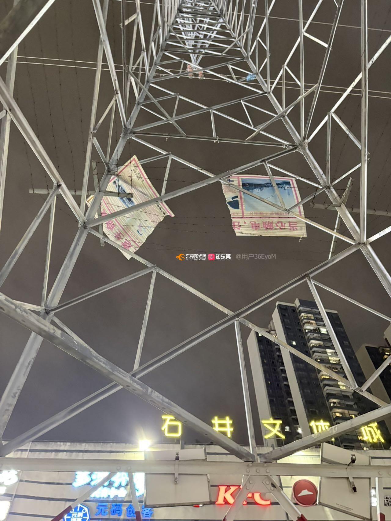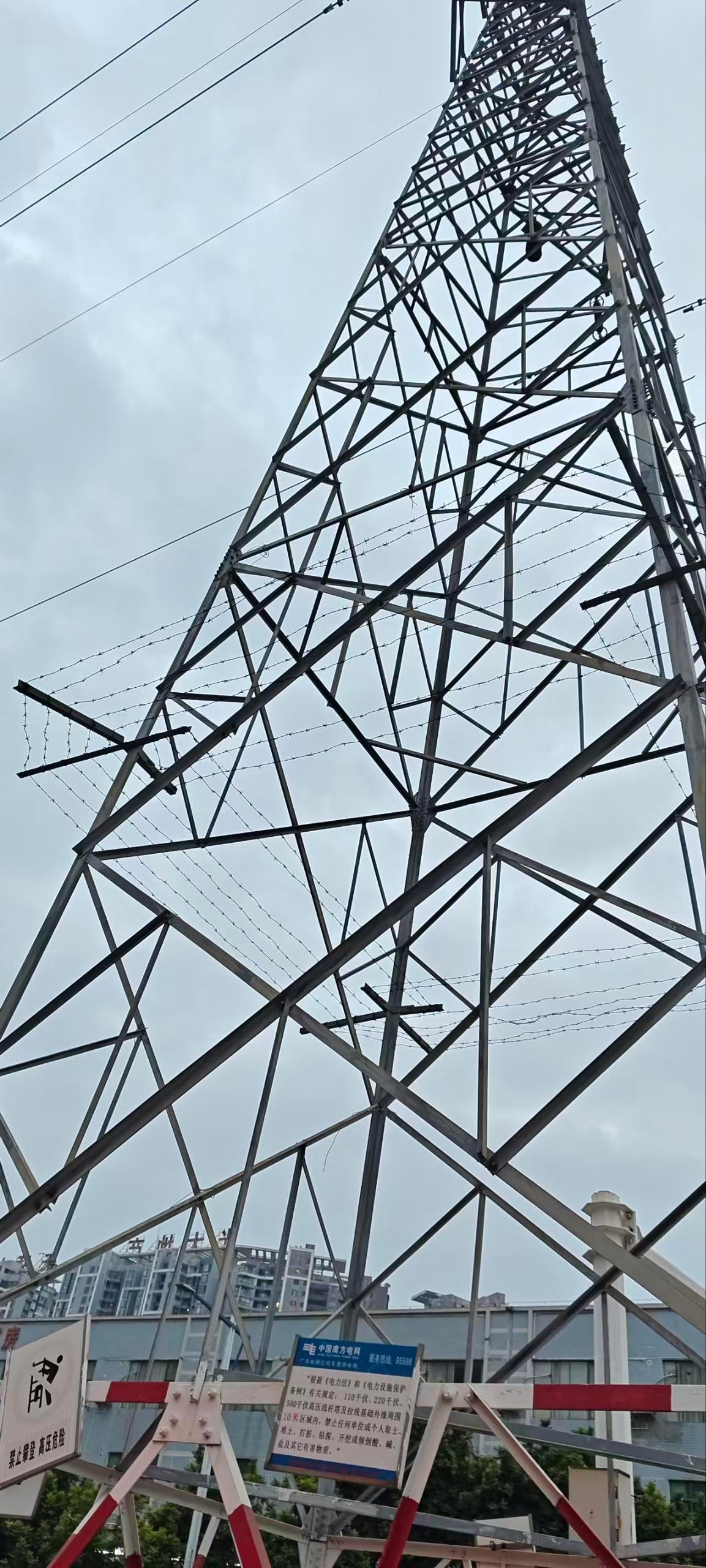 东城石井市场外面的电网塔上面的标牌应该是被风吹掉了一半 现在应该是半挂在上面 很容易掉下来砸到人 希望快点处理