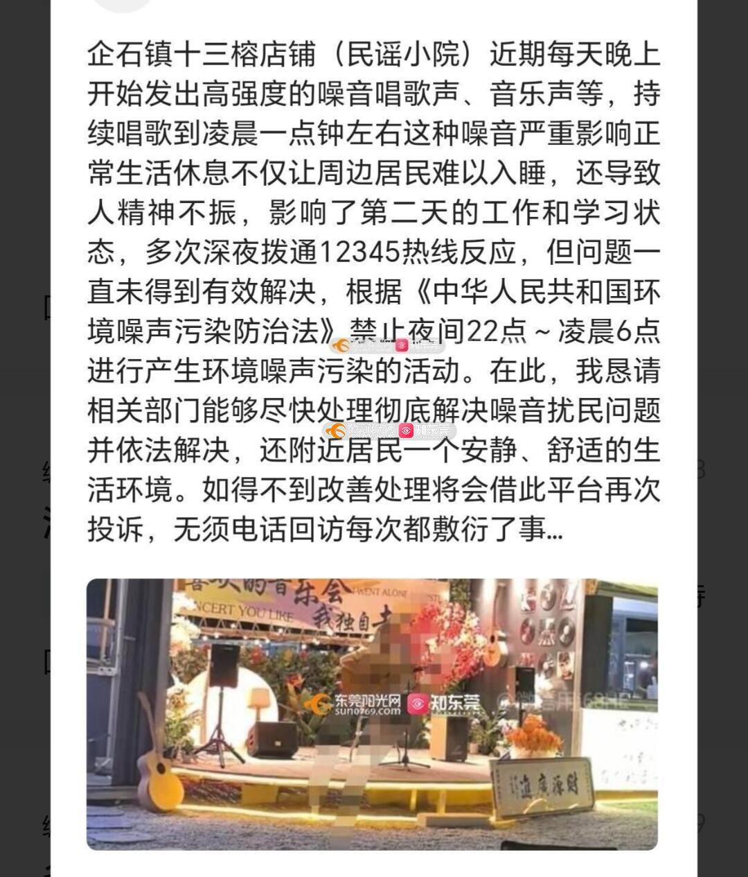 企石镇十三榕(民谣小院)晚晚八点左右开始至凌晨一两点唱歌噪音太大严重困扰周边居民休息,已多次投诉无果,相关部门每次回复都说对该处商铺工作人员进行口头教育,责令其营业期间及时劝导食客控制音量,毫无效果,已经多次投诉商家一直不整改严重扰民不应该处罚吗????