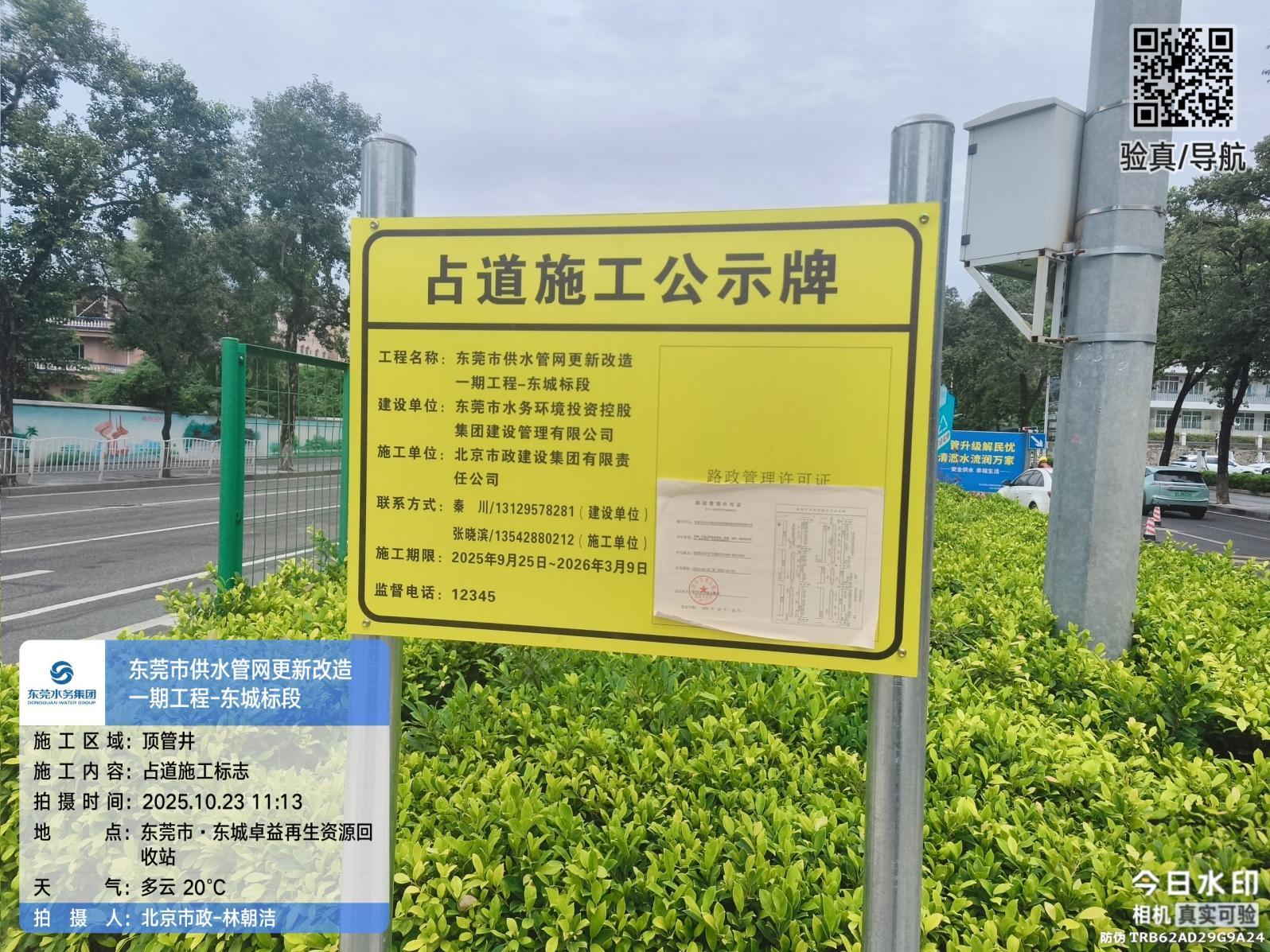 尊敬的市民,您好!您反映的问题已收悉,现回复如下: 收到反映情况后,我们于2025年10月27日16:10与您取得联系并对诉求进行办理。您反映问题的工程属东莞市水务环境投资控股集团建设管理有限公司(下称“建设公司”)所管理的东莞市供水管网更新改造一期工程-东城标段,施工单位为北京市政建设集团有限责任公司。 对于您反映的施工问题,施工单位按照路政部门要求进行围蔽及设置交通导行措施,施工单位将于11月9日起派交通安全员对路口堵车较严重的路段在上下班高峰期进行交通疏导。目前,建设公司已与施工单位沟通协调,要求施工单位科学合理安排施工工序,全力加快路面恢复工作进程。依据原定施工计划,预计该位置将于2026年3月9日完工。施工期间给您造成不便,敬请谅解。 2025年10月27日工作人员电话联系您告知上述事项。如有疑问,欢迎致电水务环境集团24小时客服热线96968,感谢您对我们工作的理解和支持!
