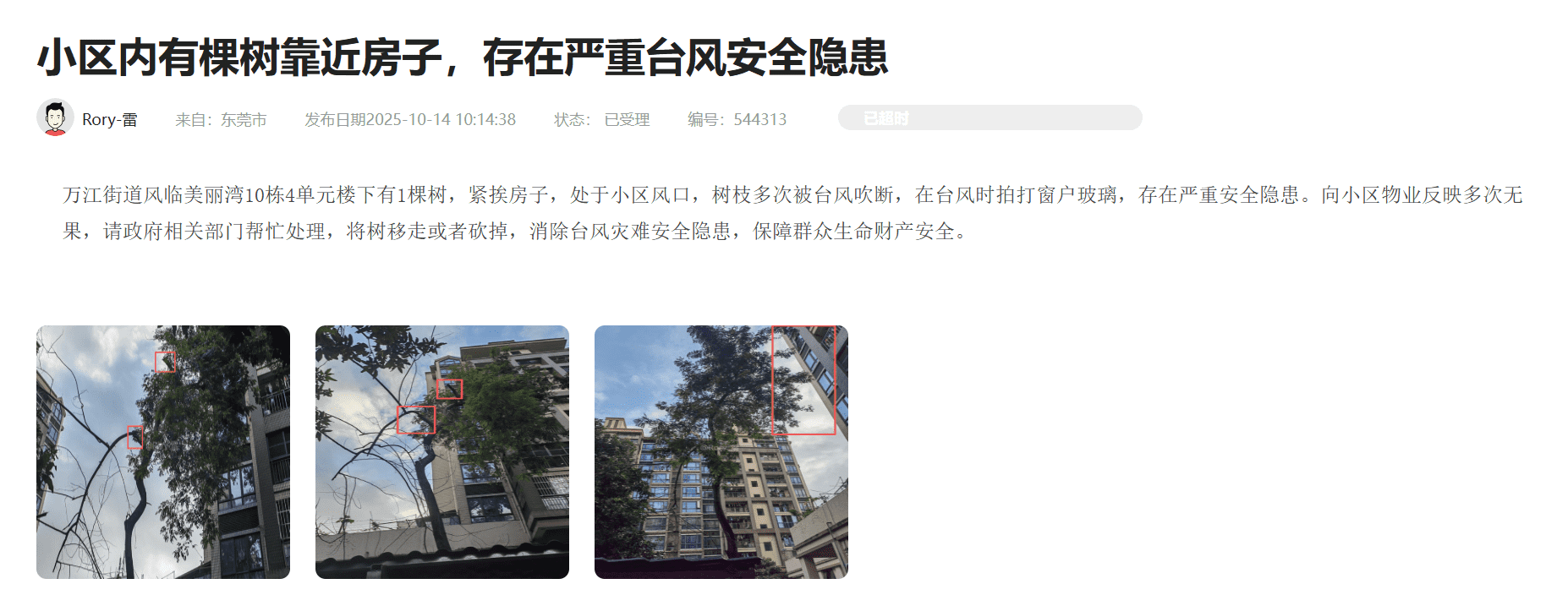 于10月14日反馈编号544313的问政小区树木多次被台风吹断,存在严重安全隐患。此问政超时没人理是何原因?置群众的生命财产于何地?请市政府出面,以于督办,谢谢!