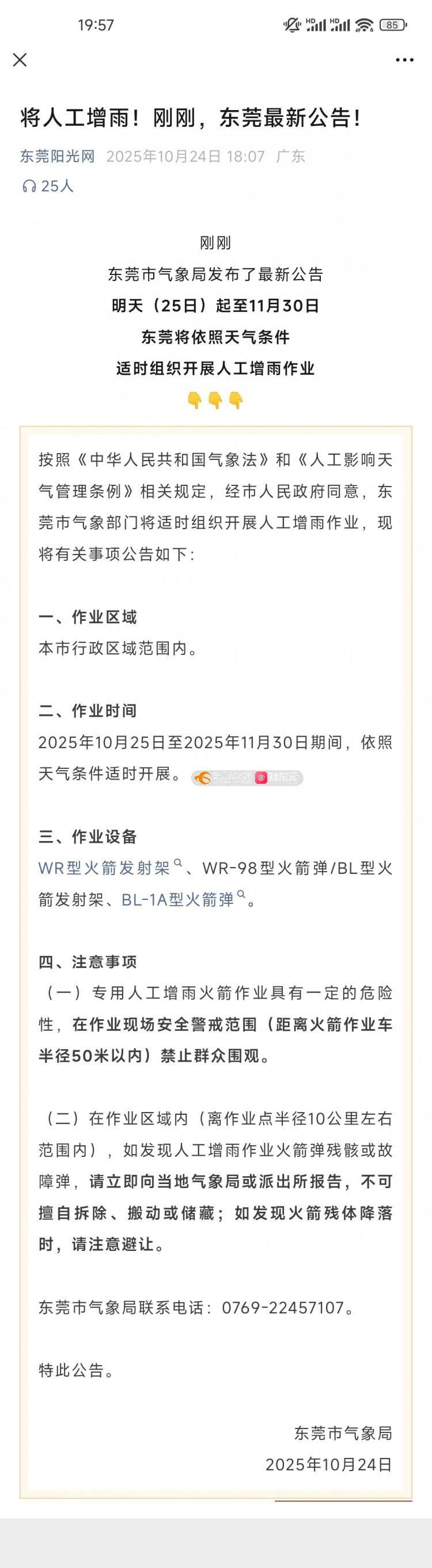 尊敬的市民,您好!您咨询的问题已收悉,现回复如下:此项工作是按上级的统一部署,为保障重大活动顺利进行,在2025年10月25日至11月30日期间,根据天气条件和重大活动保障需要,适时在全省范围内开展人工影响天气作业,感谢您的关注。如有疑问,请联系东莞市气象台,联系电话:22457107,感谢您对我们工作的理解与支持。
