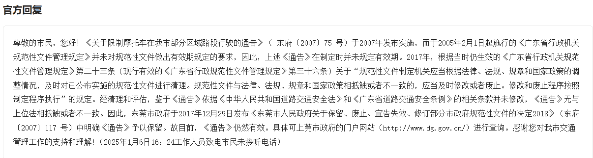 1、按照你们官方所说:“东莞市政府于2017年12月29日发布《东莞市人民政府关于保留、废止、宣告失效、修订部分市政府规范性文件的决定2018》(东府〔2007〕117 号)中保留了相关禁摩文件”,但是《东莞市行政规范文件管理办法》东府【2024】119号文件第十条明确表示:“规范文件应当规定有效期,且有效期不得超过五年,未按规定延期或修改后重新发布的,规范性文件自动失效”,该文件中明确表示,请各单位认真贯彻执行。相关禁摩文件无明确有效期限已经是不符合规定,并且五年有效期也应与2022年到期,所以现在东莞禁摩是否符合规定?此文件下发至各有关单位已经十余月,但并未有延期或其他相关举措,相关部门是否存在惰政懒政行为?时代在进步,中国也不是全国禁摩,我们丝毫不介意你们严管飙车炸街等行为,但是请给合法骑行一条出路。 2、按照《关于限制非粤S号牌摩托车在我市道路行驶的通告》东府〔2004〕171 号中表示,国省道是可以正常通行的,但是我在S256省道翠峰路段于2025年1月16日被交警拦停处罚一次以及2025年3月16日被摄像头拍照处罚一次,请问你们在省道的处罚依据是什么??要是你们说以《关于限制摩托车在我市部分地区域路段行驶的通告 》(东府〔2007〕75号)中环城路以内禁止摩托车通行这一条为准,那么第一点中所提到的文件的有效期问题也应以最新的《东莞市行政规范文件管理办法》东府【2024】119号为准,这样一来禁摩文件根本就是失效的。且文件中并没有说明国省道也禁止通行,那按照《关于限制非粤S号牌摩托车在我市道路行驶的通告》东府〔2004〕171 号文件中的国省道是可以合法通行的,国省道并不属于东莞市行政区划,请问处罚依据是什么?如果不合法,那我复议超时又该如何维权?