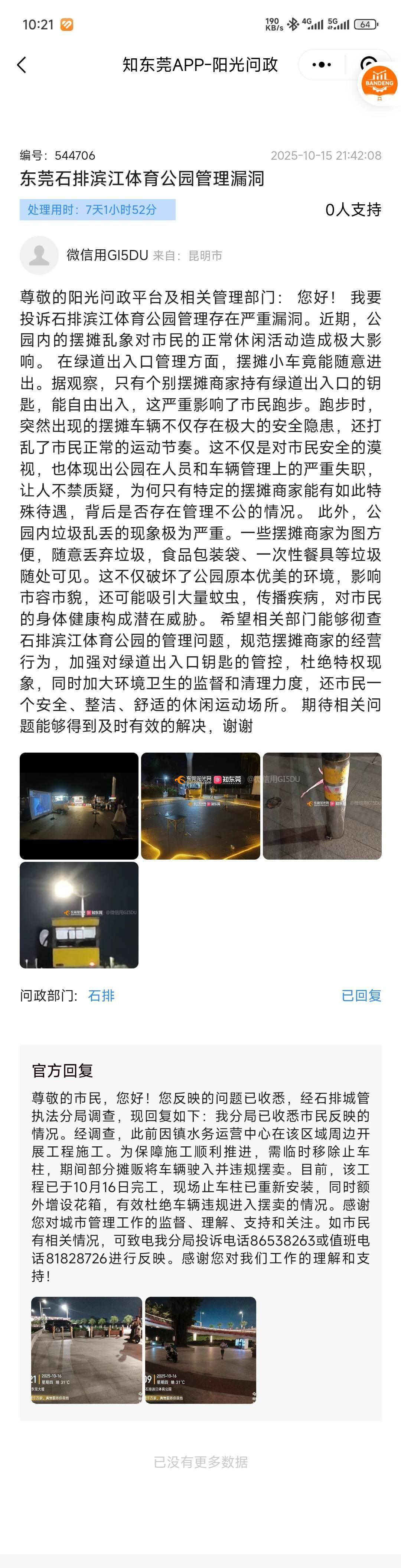尊敬的阳光问政平台及相关监管部门: 您好!我要投诉东莞市城市管理和综合执法局石排分局在石排滨江体育公园管理中存在严重失职、整改承诺失信的问题。 此前,我曾反映该公园存在摆摊车辆违规进入绿道、垃圾乱丢等乱象,石排城管执法分局回复称已于2025年10月16日完工并重新安装止车柱、增设花箱,可有效杜绝车辆违规摆卖。但从目前实际情况来看,公园内摆摊车辆依旧大量存在(附现场摆摊车辆照片为证),摆摊乱象完全反弹,其整改措施形同虚设,对市民诉求的回应极具欺骗性。 作为负责辖区市容市貌、公园管理的职能部门,石排城市管理和综合执法分局既未履行好保障市民休闲环境安全、整洁的职责,也未建立长效监管机制防止问题反弹,这种管理缺位和承诺失信的行为,严重影响了市民的正常休闲活动,破坏了城市管理部门的公信力。 现恳请12345平台督促该部门: 1. 立即对石排滨江体育公园摆摊乱象进行彻底整治,清除违规摆摊车辆; 2. 建立长效巡查监管机制,确保整改效果不反弹; 3. 对管理失职问题进行内部问责,切实履行管理职责。 期待相关问题能得到及时、有效的解决,还市民一个安全、整洁的休闲运动场所。
