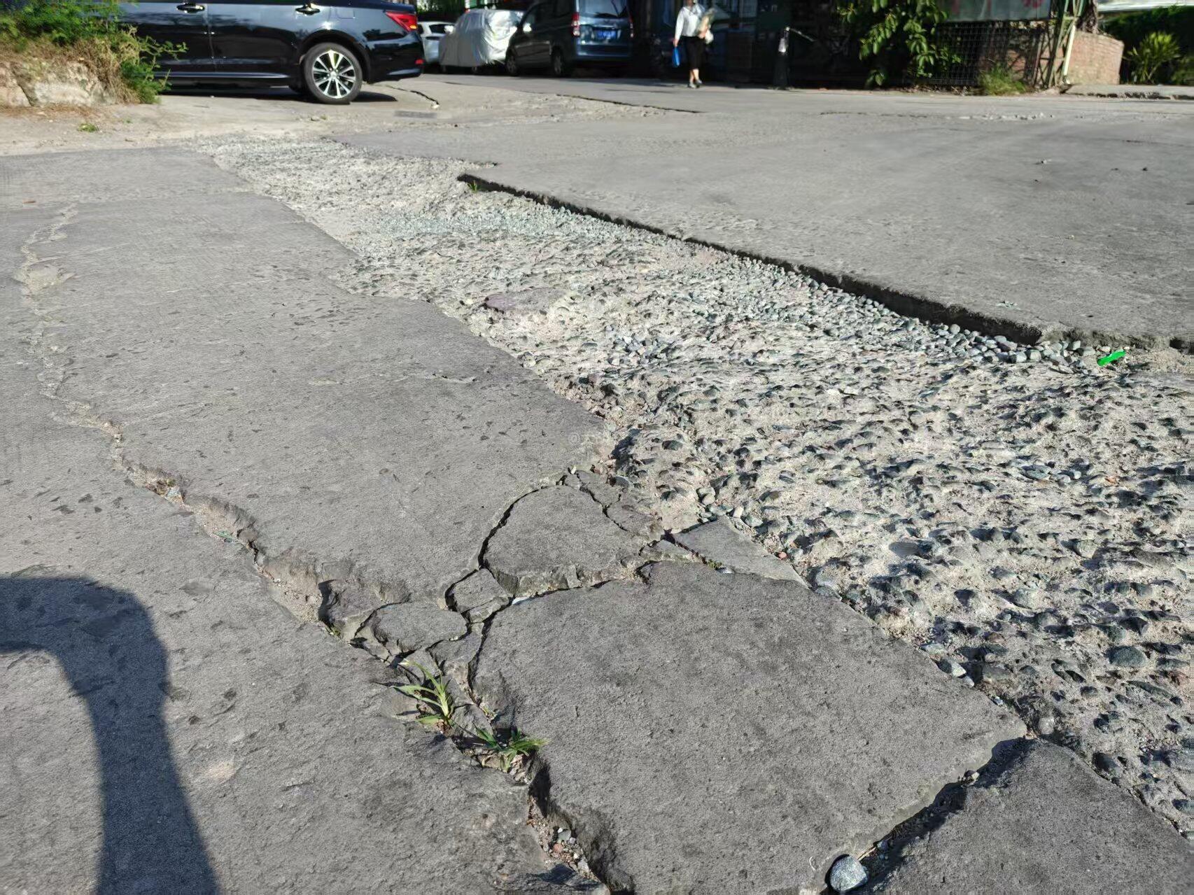 樟木头圩镇社区翠竹街和翡翠街路口路面破损严重