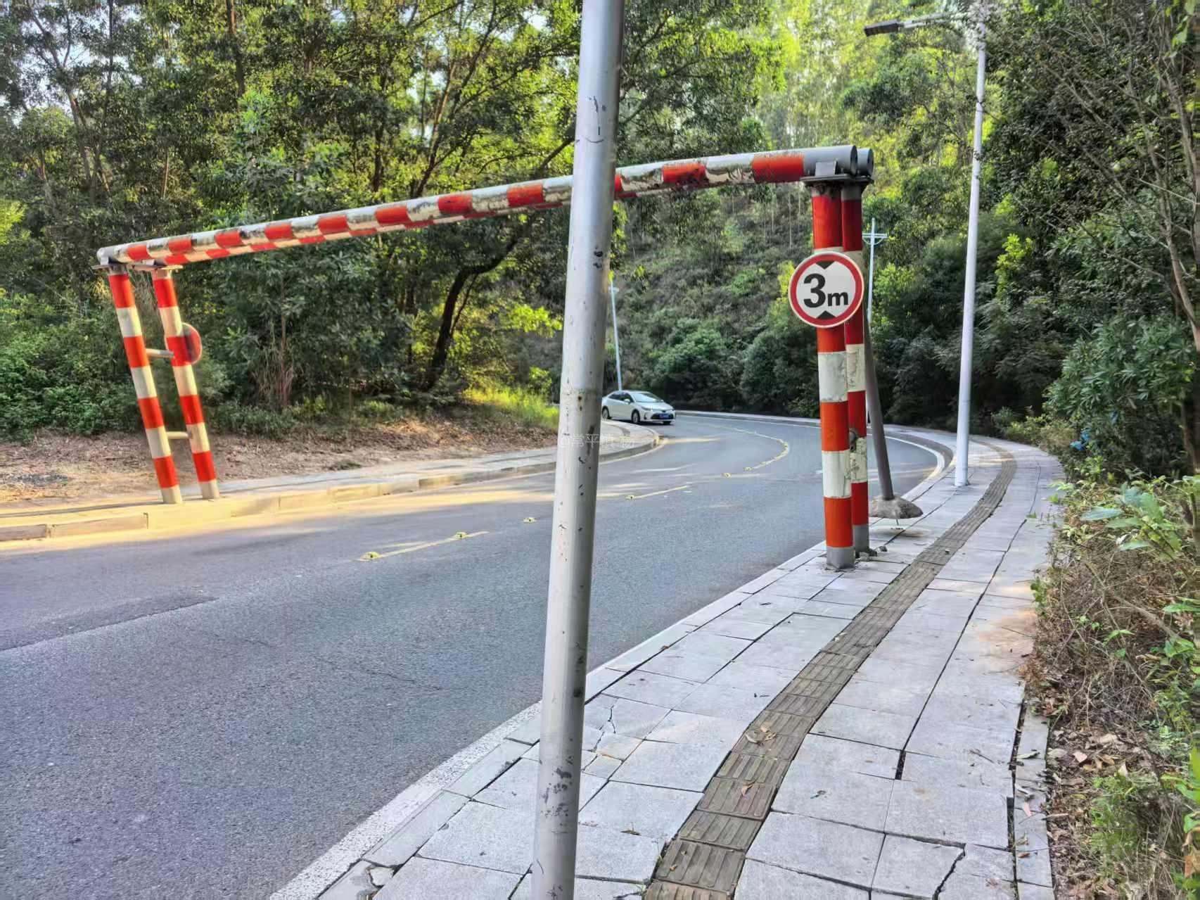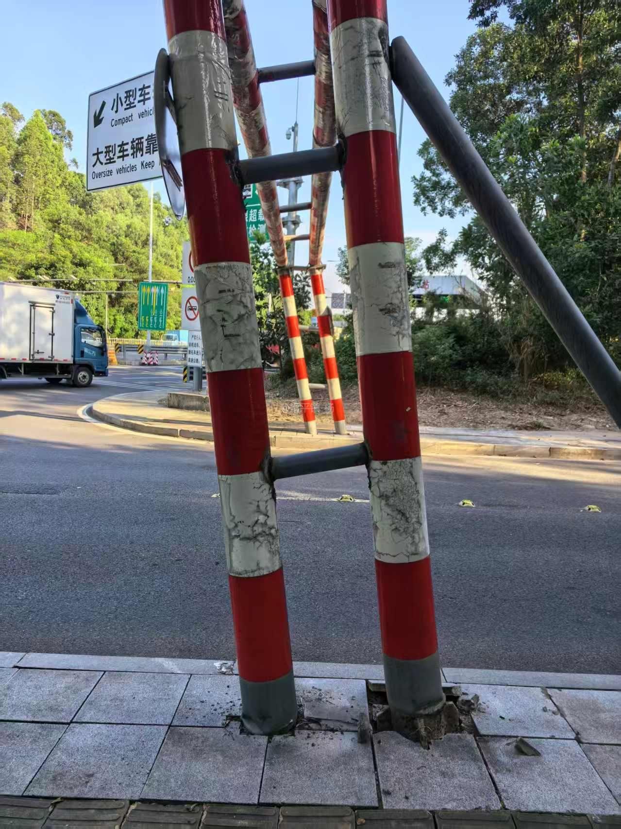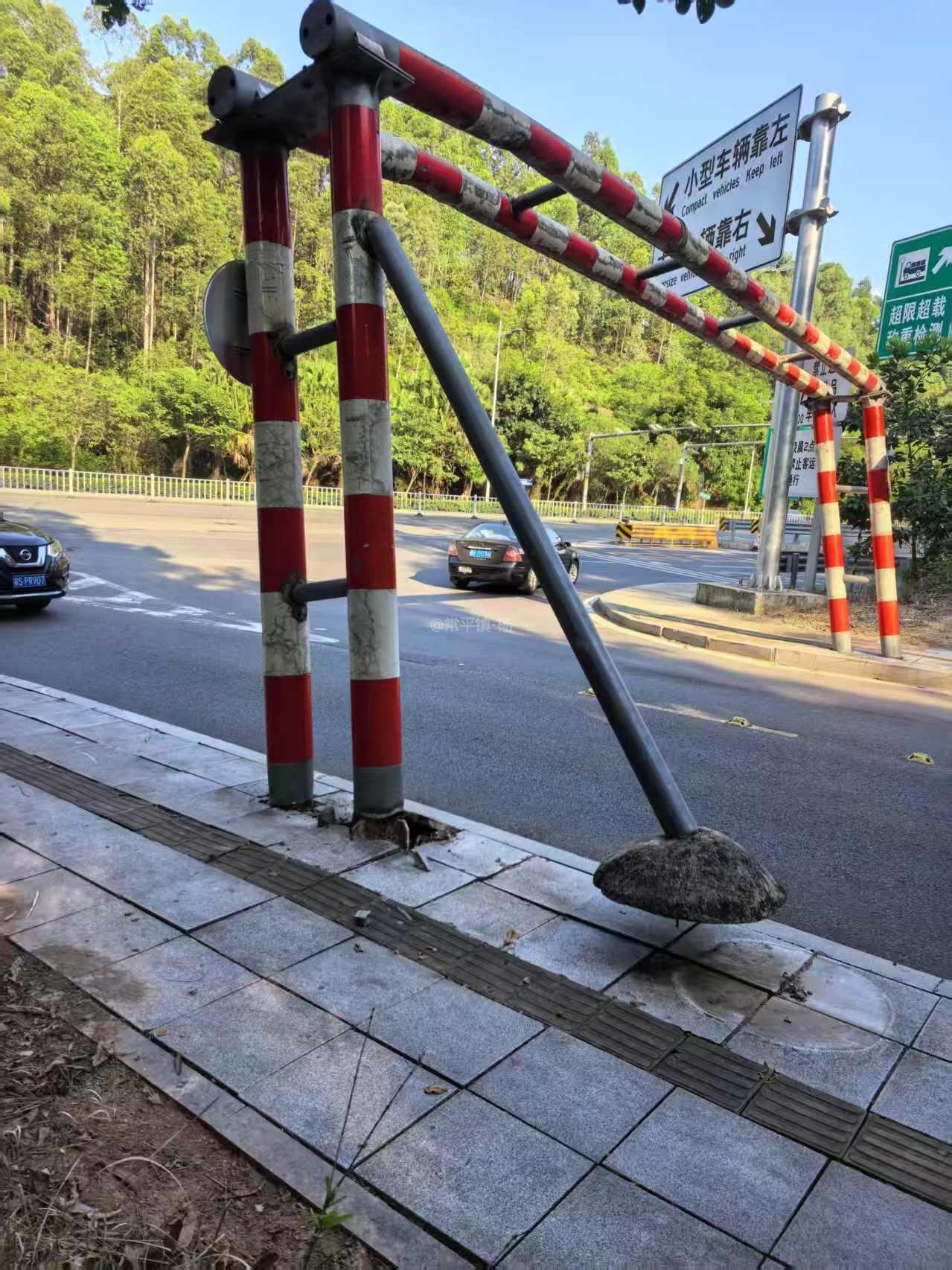 常平镇新城大道高速路口侧的小路口,限高设施被撞斜了,很多小箱式货车极限通过,隐患重重