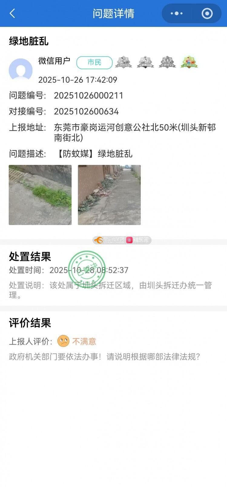 本人投诉莞城街道圳头村内数处杂草丛生、蚊虫肆虐的问题。此前,城管局回复称该区域属拆迁范围,应由拆迁办处理;但拆迁办每周三周五仅捡点纸巾等生活垃圾,长期不处理杂草,导致此处成为蚊媒疾病的孳生地。部门之间的职责推诿已造成“管理真空”,该现状与全市正在实行的严格蚊媒防控要求严重不符。 请相关部门尽快完成彻底清理,建立长效维护机制,以消除公共卫生安全隐患。