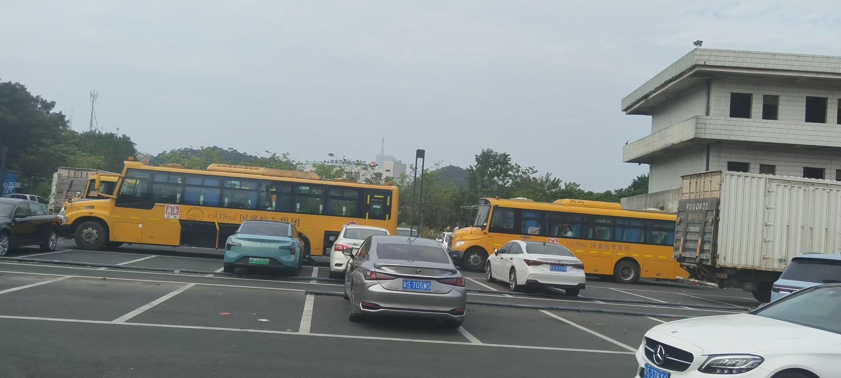 您好!黄江镇交通局对面停车场现有光明中学,东华中学及海德中学校车接送点停放大量大型货车。小孩上下学接送时都有大货车进出,大型货车体积大、盲区多,学生上下校车期间人流密集,极易引发碰撞、碾压等安全事故,对学生人身安全构成严重威胁,存在极大安全隐患。