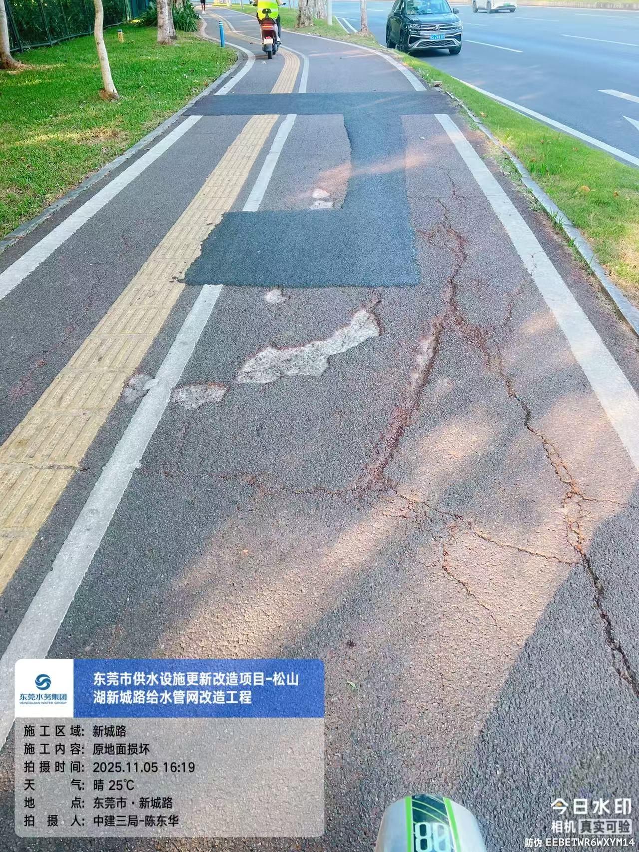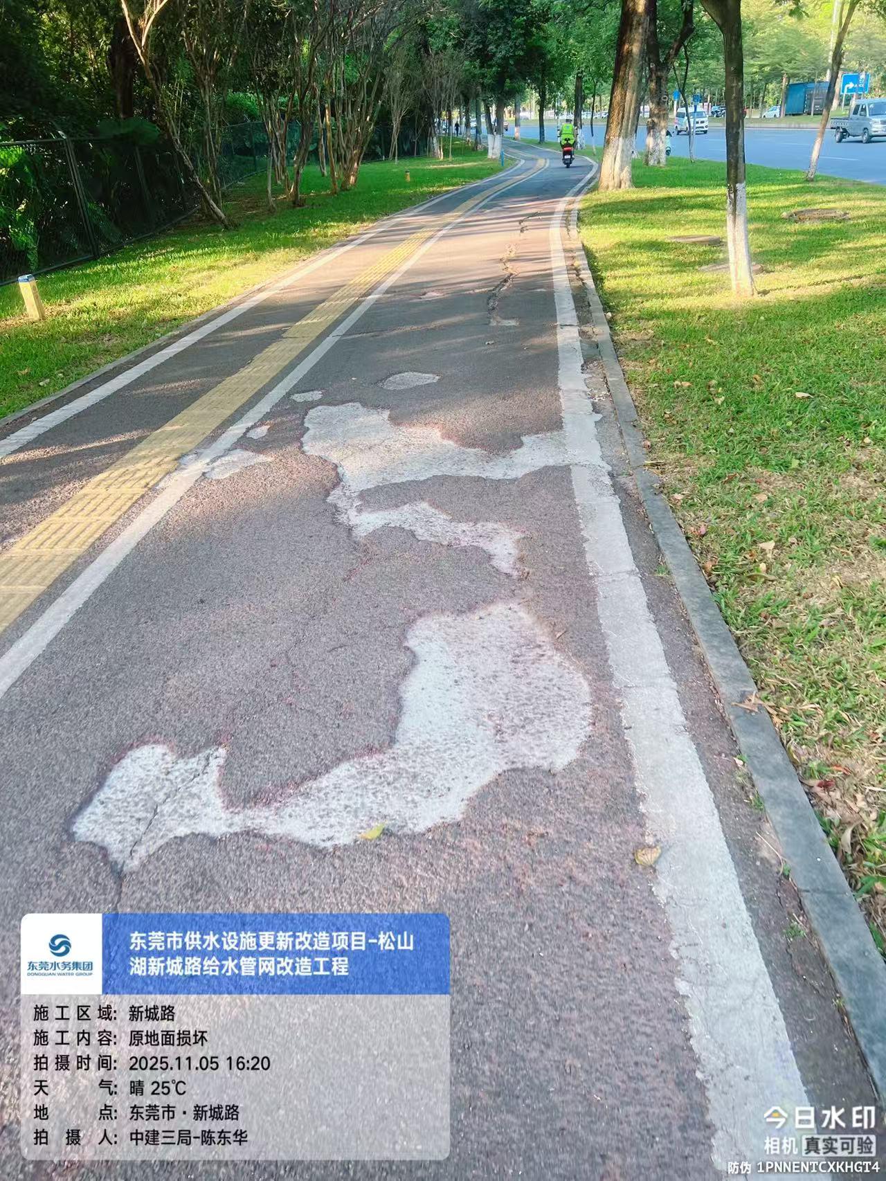尊敬的市民,您好!您反映的问题已收悉,现回复如下: 收到反映的情况后,我们于2025年11月4日17:15电话与您取得联系,并对诉求进行办理。您反映问题的工程为东莞市水务集团建设管理有限公司(下称“建设公司”)负责代建管理的东莞市供水设施更新改造工程新城路给水管网改造工程,施工单位为中建三局集团(东莞)投资建设有限公司。 您反映的路段预计2025年12月上旬完工并开放通行。施工单位根据交警松山湖支队的要求,设置临时非机动车道。因该路段为交通繁忙主干道,非机动车道及人行道需兼顾防滑性、耐久性与快速施工需求,前期初选的普通防滑沥青方案未通过荷载测试。水务环境集团联合市政设计研究院开展多轮方案比选(含改性沥青、彩色防滑沥青等3类材质测试),导致后续工序无法按计划启动。目前,建设公司要求施工单位加强安全文明施工管理,保证安全文明施工,尽可能减少施工对市民交通出行的影响,施工期间给您造成的不便,敬请谅解。 2025年11月4日,工作人员致电告知您上述情况。如有疑问,欢迎致电东莞市水务集团24小时客服热线96968,感谢您对我们工作的理解和支持!