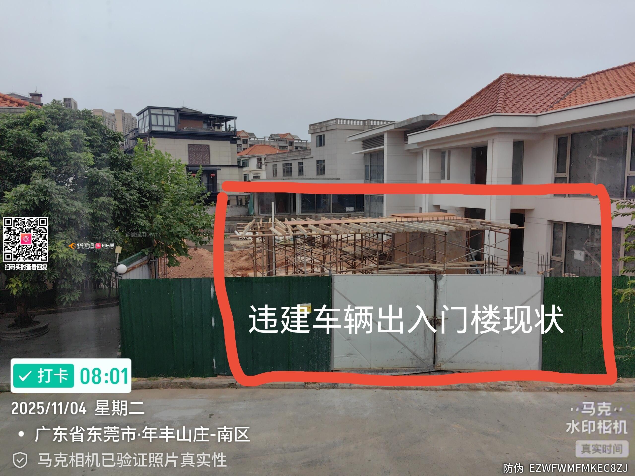 东莞市东城年丰山庄新牡丹路16号,1.花园前路边护栏违建向外扩,侵占公共绿化地方。2.违规改变原房屋小区规划各房屋用途,把前面1米高铁花护栏改成汽车出入大门楼,严重影响行人行车安全,和住房周边人的安全健康安宁。(现情况违建进行中。) 恳请相关部门严正处理,还群众一个安全安宁生活环境要求:①恢复到护栏原来位置,只能做护栏,不得侵占公共地方。②花园护拦不能改建汽车出入门口。