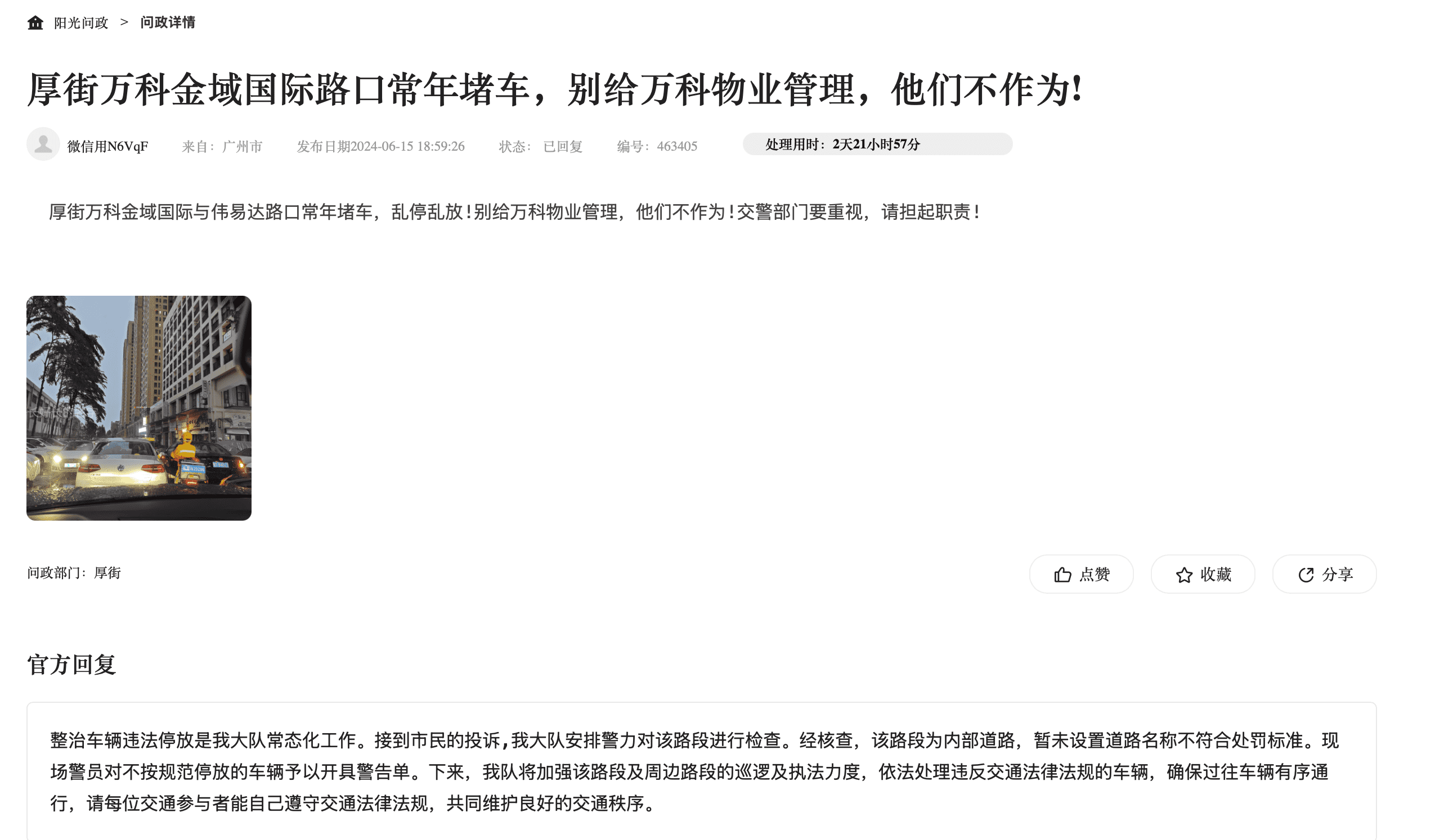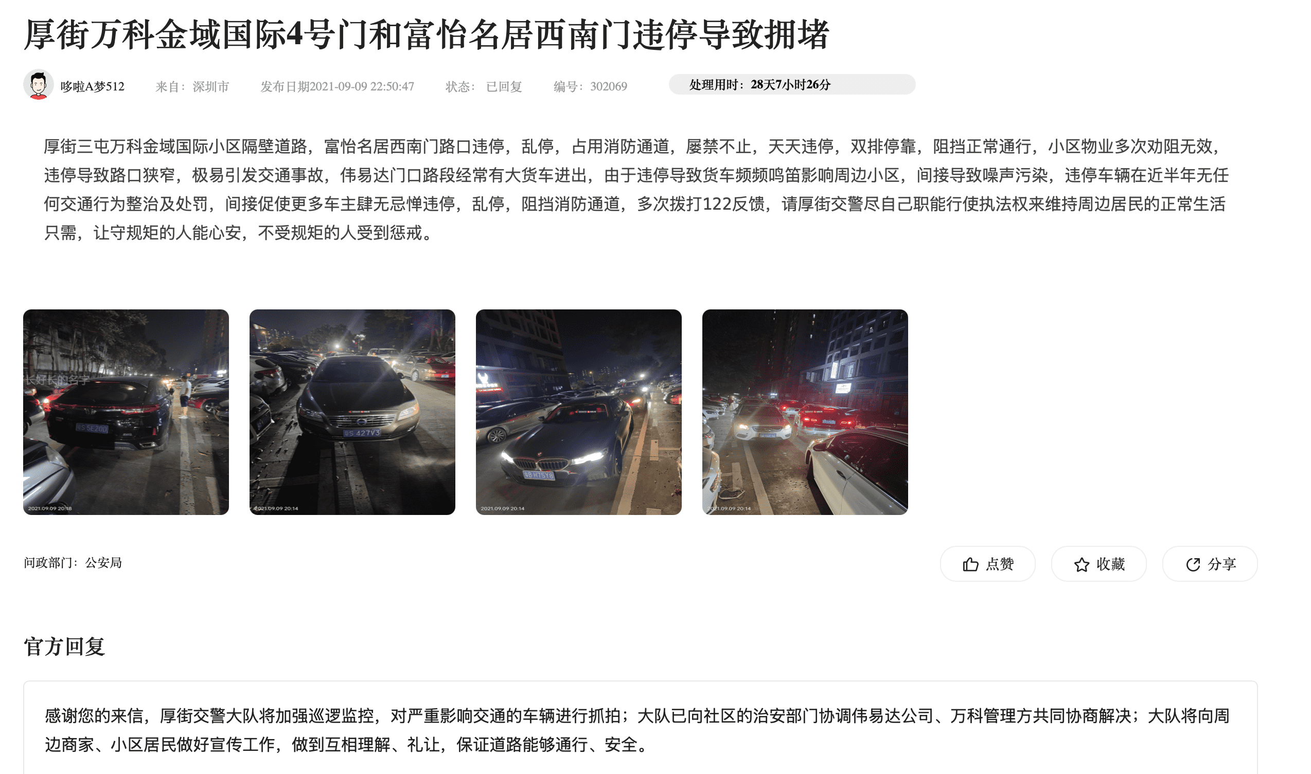 我们是厚街三屯万科金域国际的业主,与富怡民居还有伟易达中间间隔的两条道路。 我们每天早上上班都很痛苦的被拥堵在地下停车场,经常10几20分钟出不出去停车场,找各部门解决,现在像个皮球一样,踢来踢去。 物业:我们管辖权,我们只能劝导,但人家不听我们也没办法。 交警:这条道路属于物业内部红线道路,没有街道名,交警没办法执法,也只能劝。 阳光网反馈的答复: 劝没有任何警示和威慑意义,我知道你拿我没办法,我就不听你劝,劝没有任何用处。 我想问问: 1)请问政府,该如何能增加马路的命名?什么时候能增加 2)交管部门能否连同其它部门,做起有效的监管。 这里不是没有停车位,商场也有很多停车位。有些人就是为了省几块的停车费,故意违停,给别人带为不便。 已经是多次反馈,希望政府能重视,真的给百姓能带来改善!!!