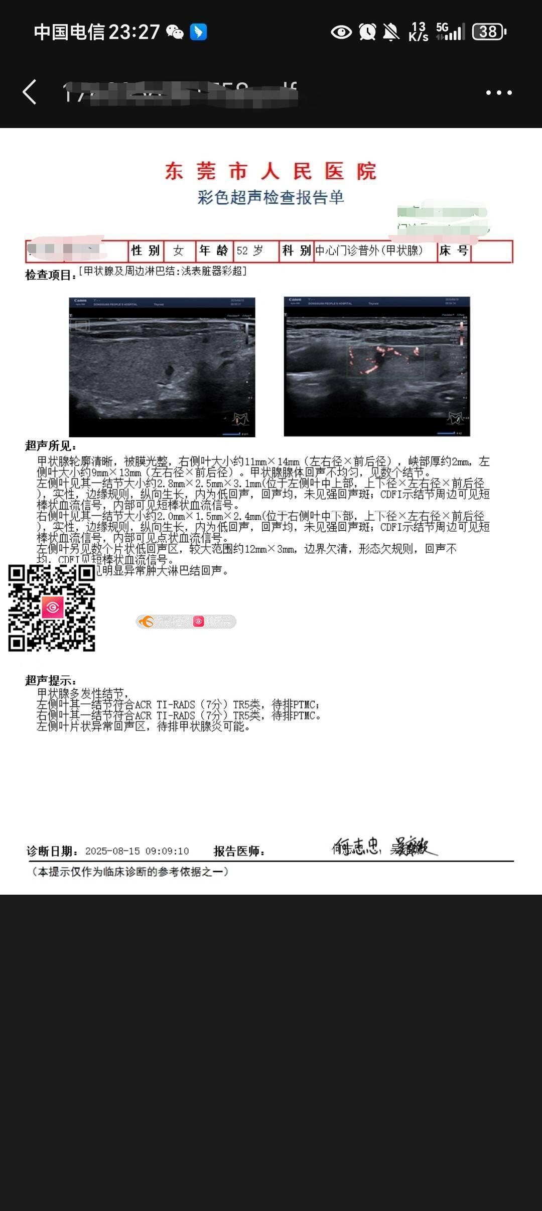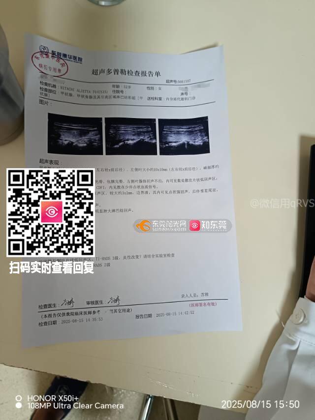 起因是东莞市人民医院红楼院区我妈妈检查出是5级甲状腺结节要做手术,我们怕误诊又去康华医院重新做一份检查,我们在8月15号在康华做了检查他们给出的结果是左边3级和右边2级,跟红楼那边的完全对不上,后面我们要求重新做检查,期间换了两个B超室,第二次给出的结果还是不对给出的4级但是还是对不上,后面做了大概半小时左右他们查对方结果还是跟红楼对不上,后面就反反复复查,大概做了40分钟左右没有结果外面的其他患者也等急了就催他们,他们后面就拿着我们在红楼院区的重新抄了一份给我们,让我们很生气。后面给医生看医生也建议做手术我们就去红楼做了手术。因为当时我们也不知道投诉渠道这件事情就不了了之了,没有投诉也没有叫他们退款。 时间到了11月1号在红楼那边复查回来在路上了解到可以打电话给12345投诉他们,当时回家就打电话投诉,后面康华他们工作人员就打电话过来已当时怎么不说,还有后面给你复查拒绝退款。后面市政府投诉部门打电话过来他说也沟通不了他们不同意,给我一个电话22252782约个时间跟康华那边调解或者直接找法院起诉,我就说算了没有时间跟他们耗不搞了。身为消费者医院对我们没有半点保障,相当不负责。