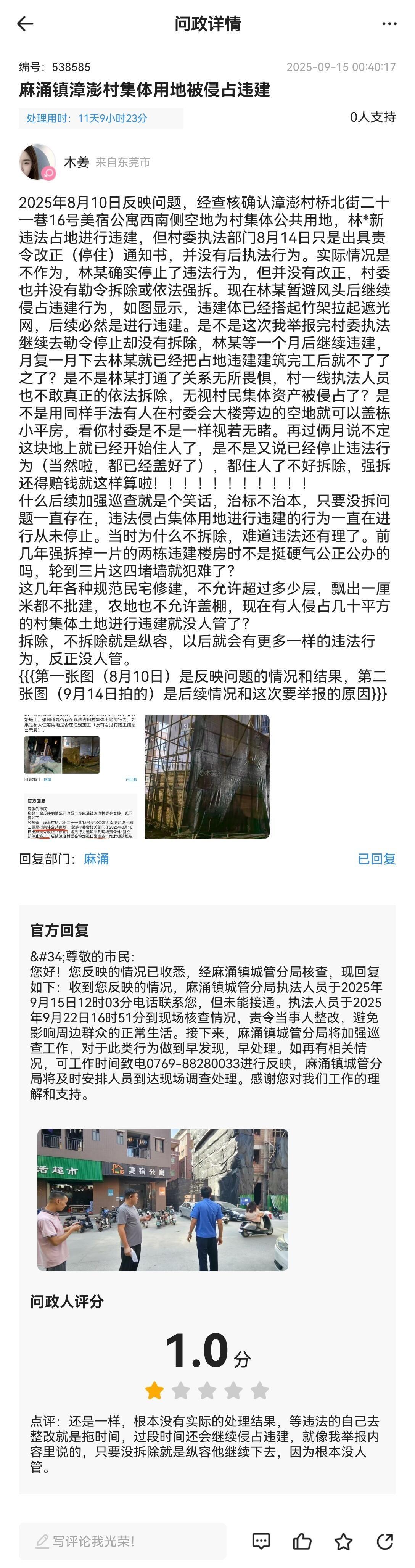 麻涌镇漳澎村桥北街二十一巷16号美宿公寓西南侧空地为村集体公共用地,林*新违法占地进行违建。8月份第一次举报后执法部门执法人员只是警告后无作为。9份第二次举报后依然警告后无作为。侵占违建行为就是被制止后停一段时间就继续动工,不断重复,执法部门没有任何纠正行为(勒令拆除或强拆),到底是无能懒政还是纵容包庇。今天11月8日又开始动工了,侵占违建行为依然继续,就像第二次说了那样,举报完之后林*新消停一段时间后继续占地违建行为,这次举报之后说不定结果还是一样,直到公共用地被侵占,违章建筑完工。村委会管不了,城建局也管不了,国土局还是管不了。我倒是想问问到底哪个部门能管得了?