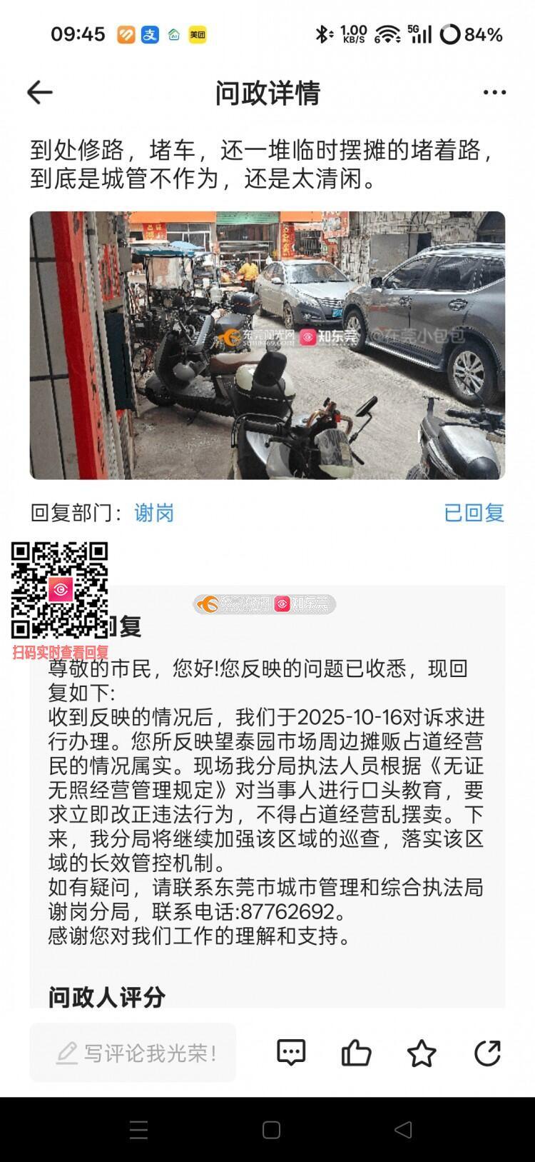 尊敬的市民,您好!您反映的问题已收悉,现回复如下: 收到反映的情况后,我们于2025-11-09对诉求进行办理。经查,您所反映泰安路六巷1号周边流动摊贩占道经营的情况属实。现场,执法人员根据《无证无照经营查处办法》对流动摊贩开展普法宣传教育,要求立即改正违法行为,不得占道经营。下来,我分局将继续加强该区域的巡查,加强卫生保洁力度。 如有疑问,请联系东莞市城市管理和综合执法局谢岗分局,联系电话:87762692。 感谢您对我们工作的理解和支持!