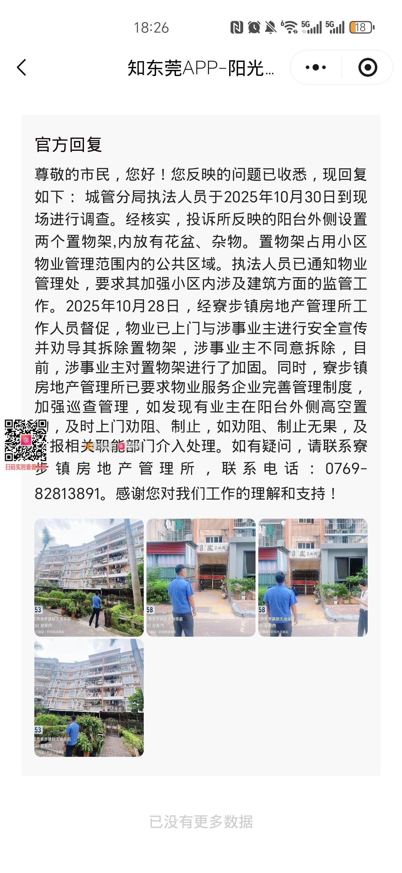 东莞市寮步镇横坑新天地华庭小区37座2单元402居民在阳台外侧违规设置置物架,堆放花盆、杂物等过重物品(如附件图片所示)。当下正值台风多发季节,此类高空置物存在极大安全隐患: 一方面,台风天气风力强劲,这些置物架及堆放物极易被吹落,一旦坠落,不仅可能损坏楼下公共设施,更会对行人及其他住户生命安全构成严重威胁,后果不堪设想;另一方面,杂物长期暴露在外,也影响了小区整体环境美观,与文明社区建设相悖。 为保障相关住户的生命财产安全,营造安全、整洁的居住环境,恳请相关涉及部门高度重视此事,立即组织人员对小区高空违规置物情况进行全面排查,并采取有效措施:一是对涉事业主进行安全宣传与劝诫,要求其尽快移除危险置物;二是建立长效巡查机制,防止类似隐患再次出现。 盼贵部门及时处理并回复处理结果,感谢您的重视与付出! 此致 敬礼! 要求拆除,拆除,拆除,必须拆除,加固有什么用