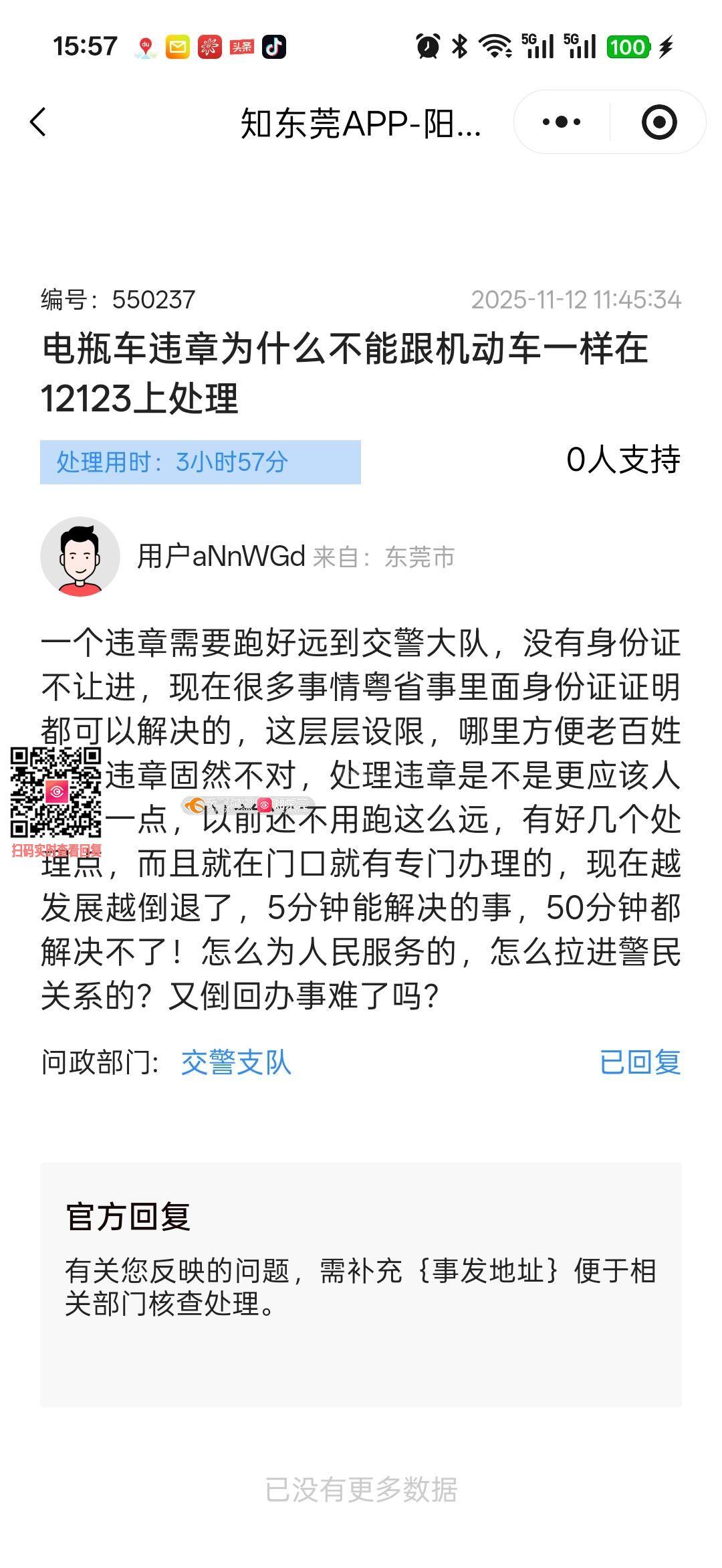 看看下面图片,你们回答的什么!我标题清清楚楚是电瓶车为什么不能在12123上处理违章!现在很多时候都可以通过粤省事上的身份验证来处理事情,偏偏今天去处理违章非要刷身份证才让进,跑那么远,处理不了,我说登记一下也不给,前面的人进了,保安说处理事故没有身份证可以,我这处理违章必须身份证原件!为什么以前处理就可以身份证号都能解决?现在越来越设限?干的是人事吗?是越来越方便群众吗?回复一点正题没提,偏偏让补充个地址,这处理方式真是服了,避重就轻,一点没解决!